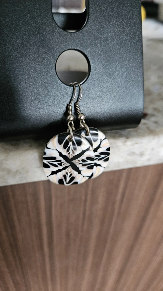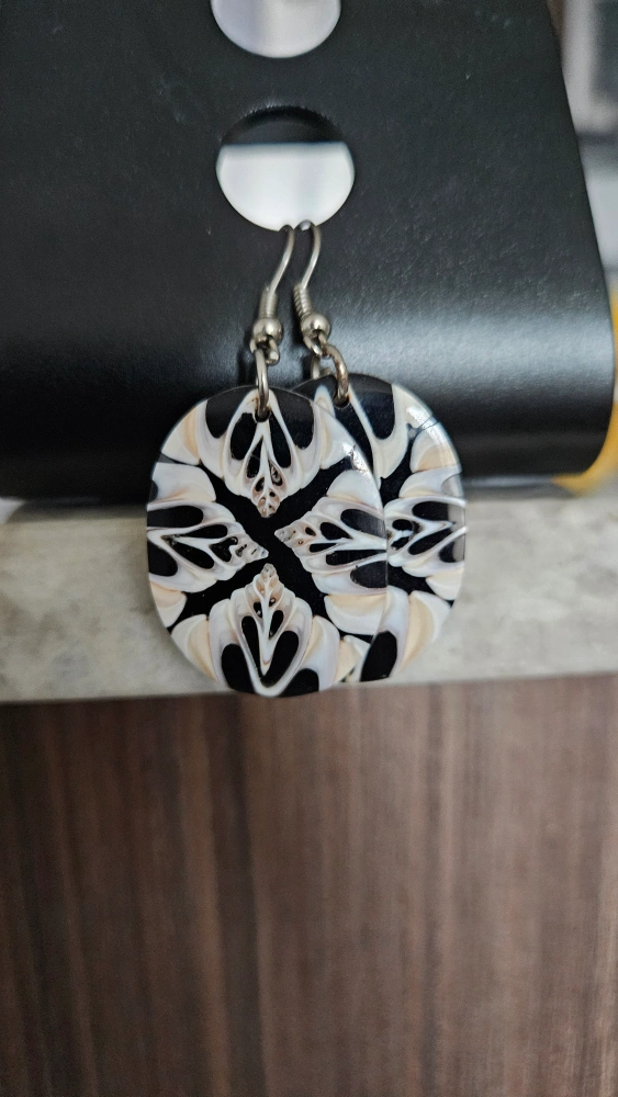 Round earrings with a black and white design. They are made of beautiful Coral. Purchased in Fiji.