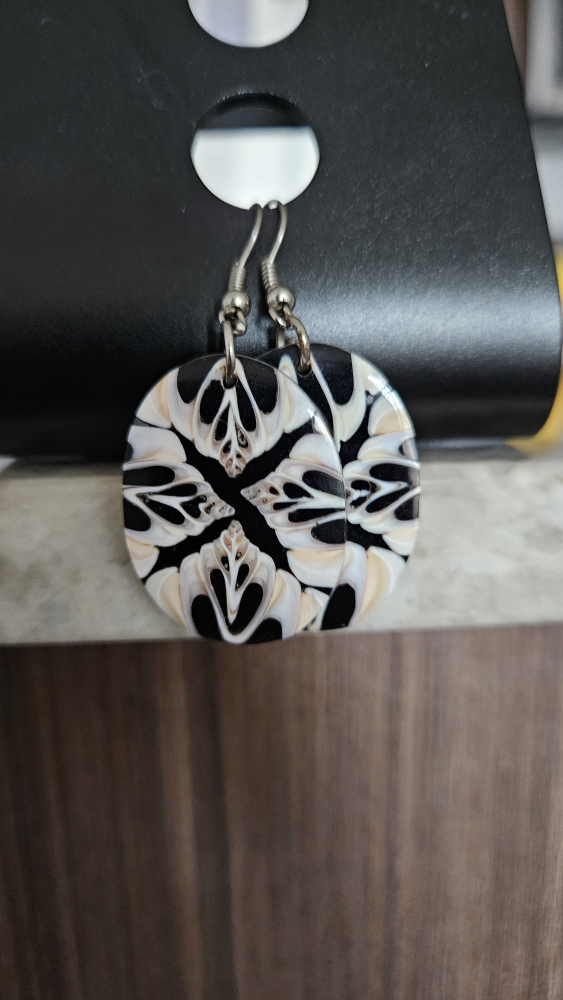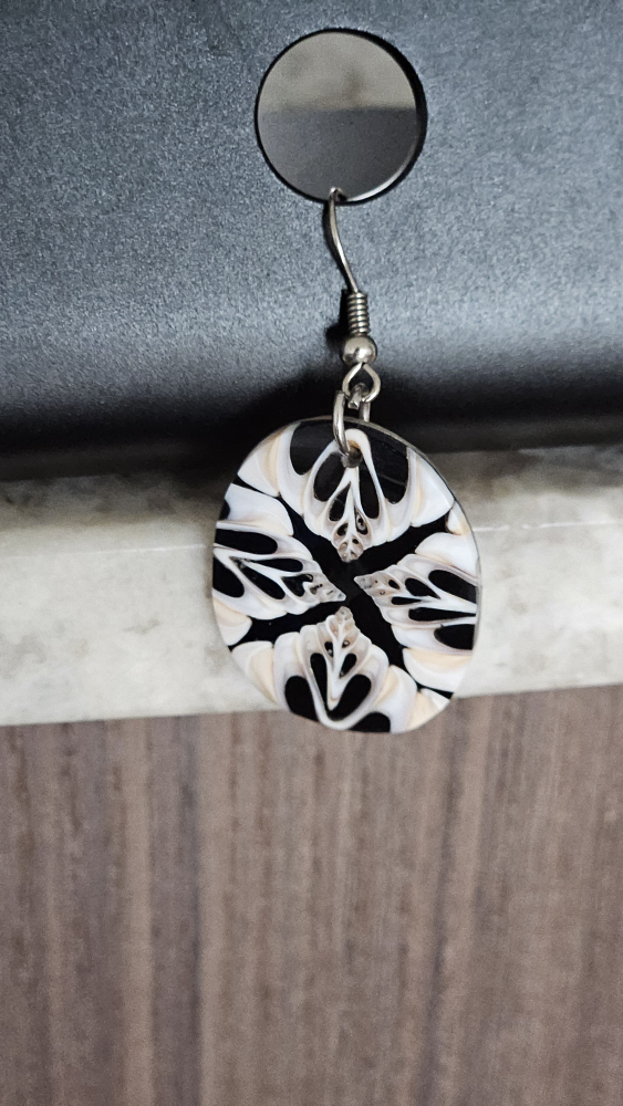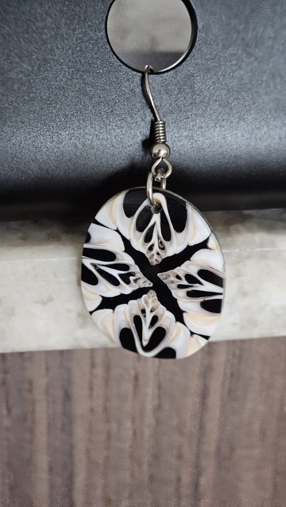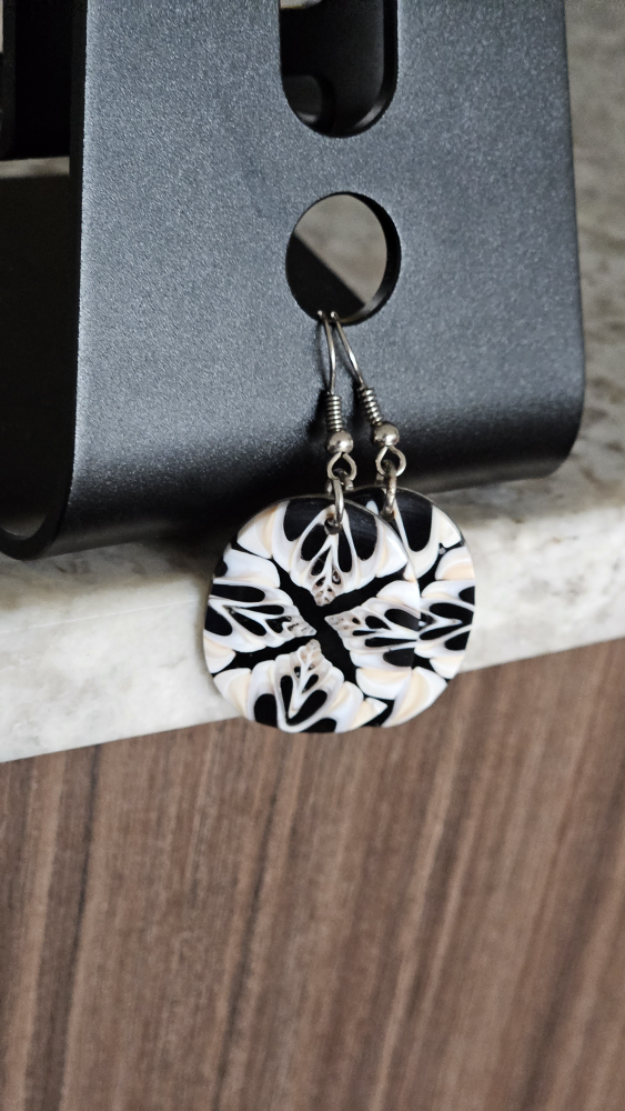 Round earrings with a black and white design. They are made of beautiful Coral. Purchased in Fiji.