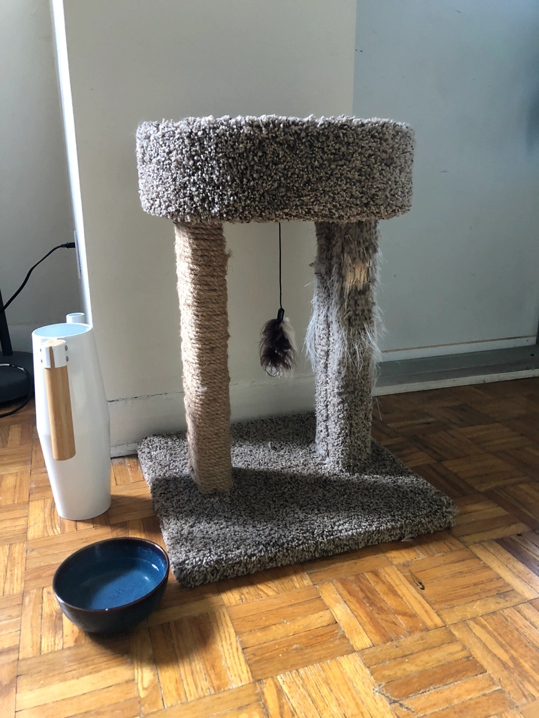 Small cat tree with two scratching posts and a top perch. Includes a dangling toy. My cat wore down the right carpet side, but left side is pretty much intact.