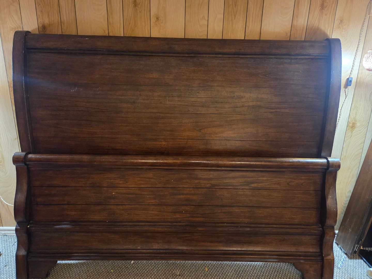 A beautiful wooden sleigh bed frame in a rich, dark brown finish. It's a sturdy and classic design that would suit most bedroom decors. This bed frame is made of solid wood.