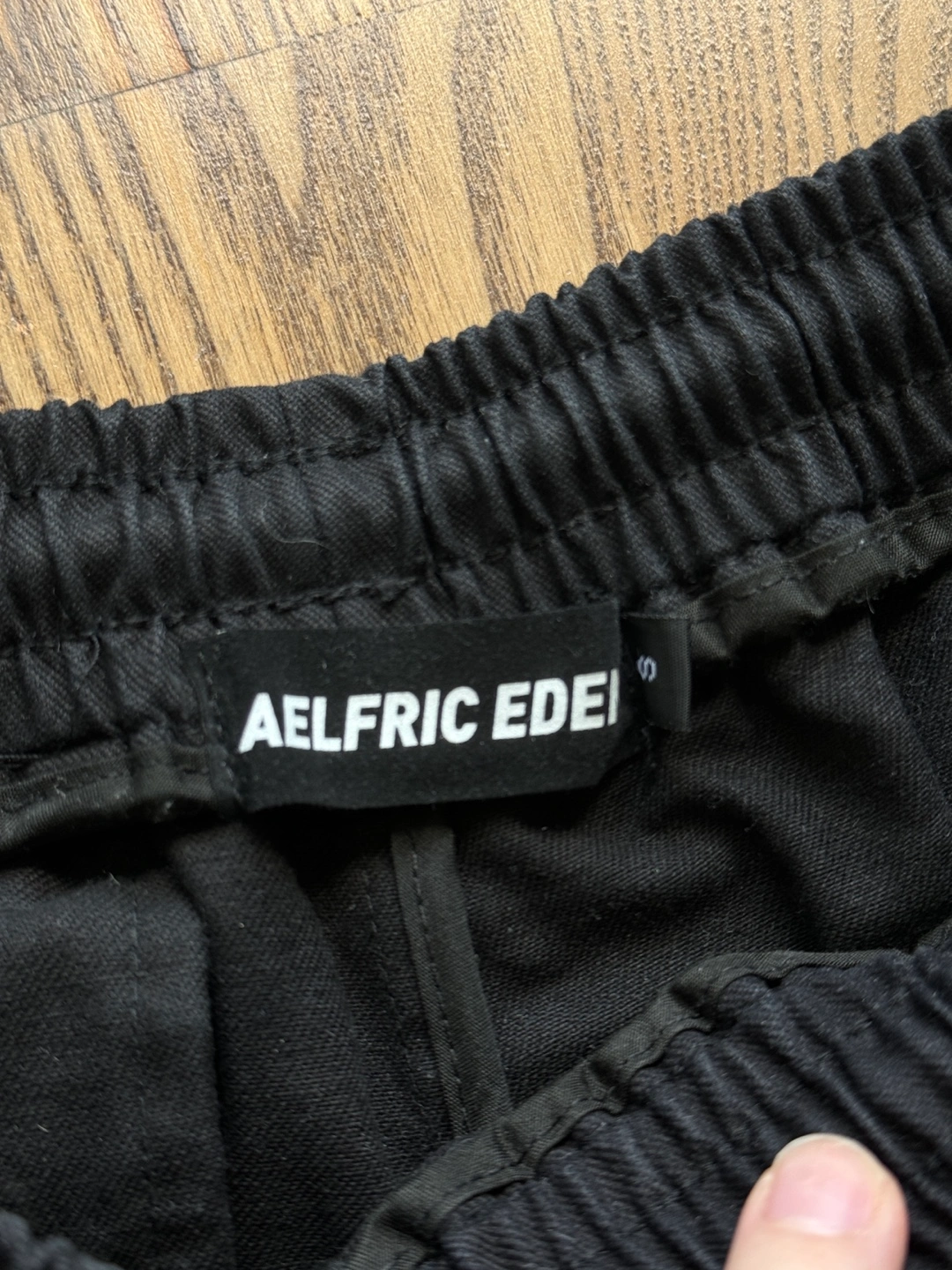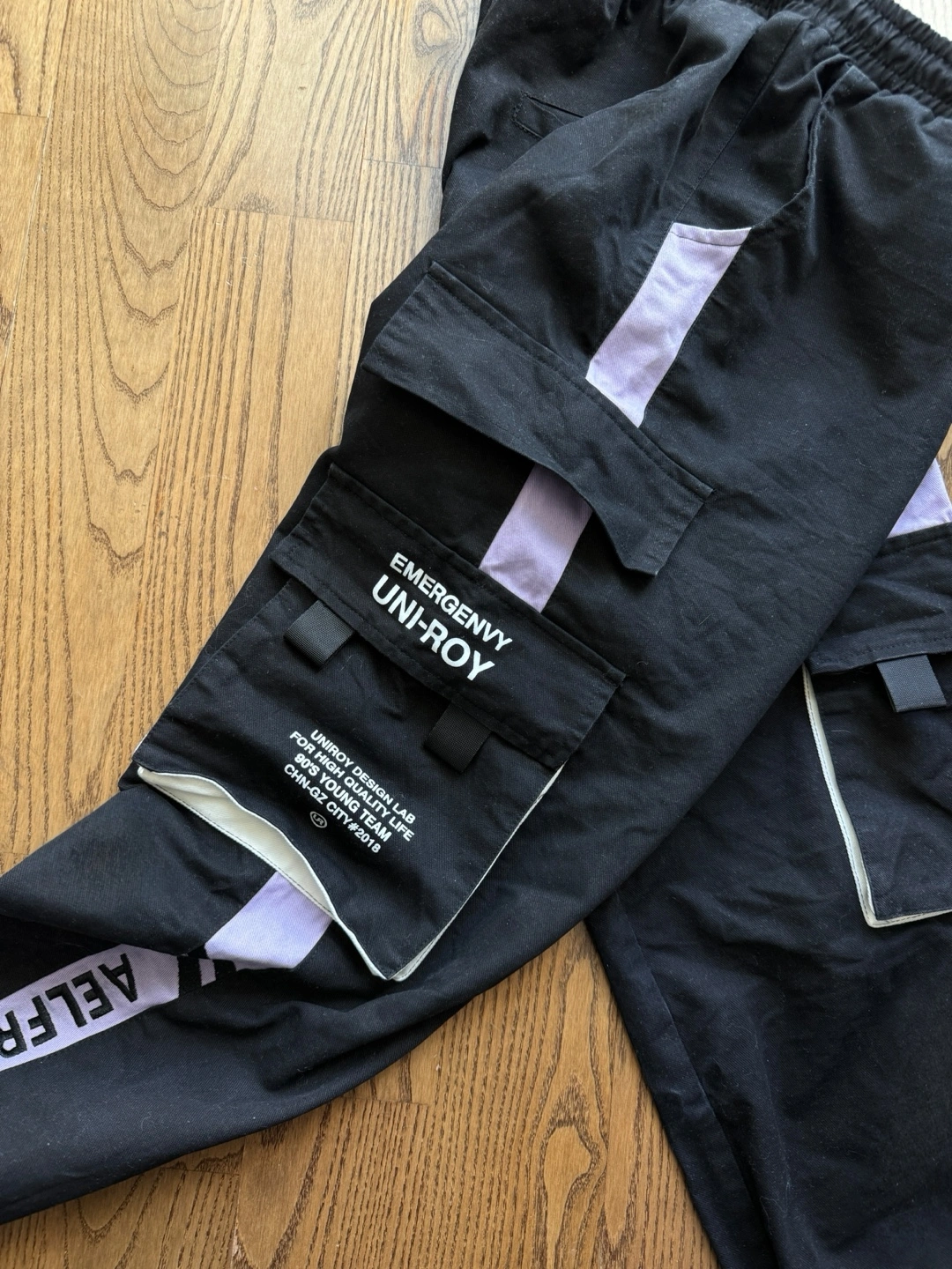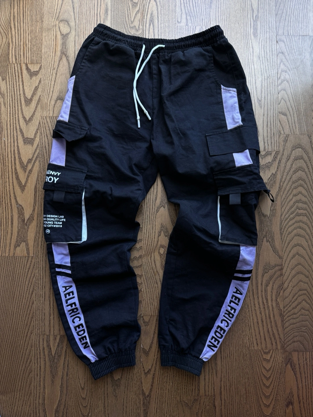 Black cargo pants with lavender accents. Features multiple pockets and Aelfric Eden branding throughout. Elastic waistband and cuffed ankles. Size small.