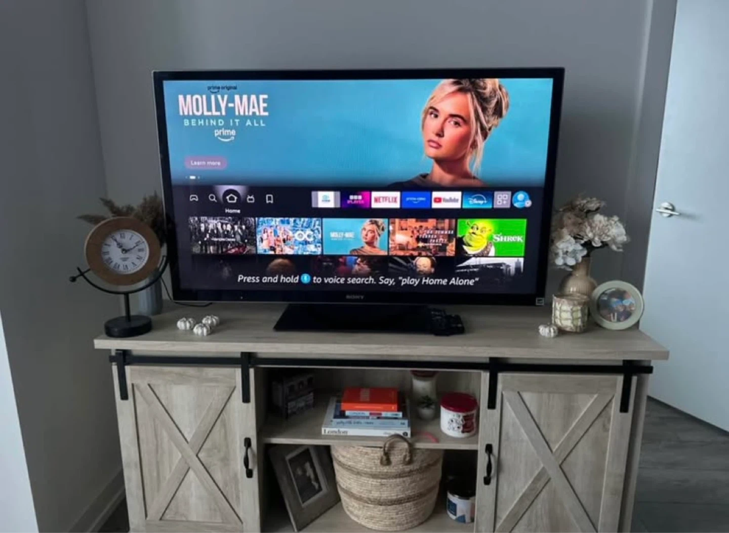 This TV stand features a rustic wood grain finish and sliding barn doors. It has an open shelf in the middle with two cabinets on the sides. Perfect for storing media consoles and decor items.