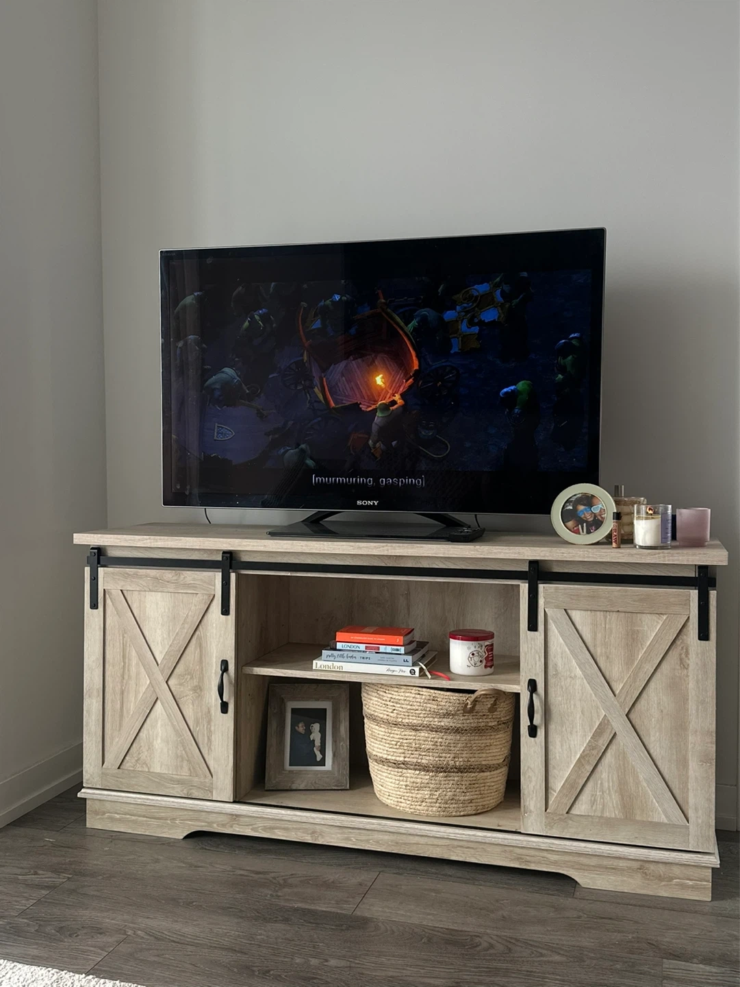 Farmhouse Sliding Barn Door TV Stand - Wood Grain