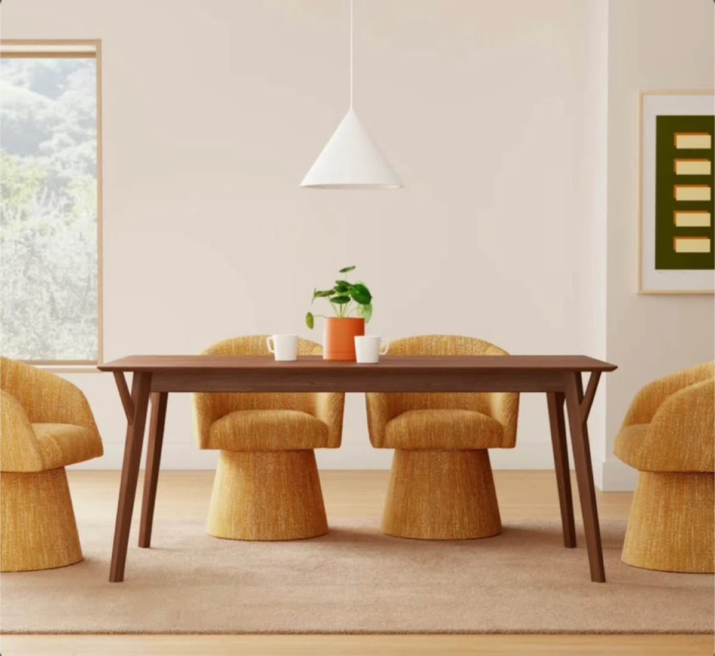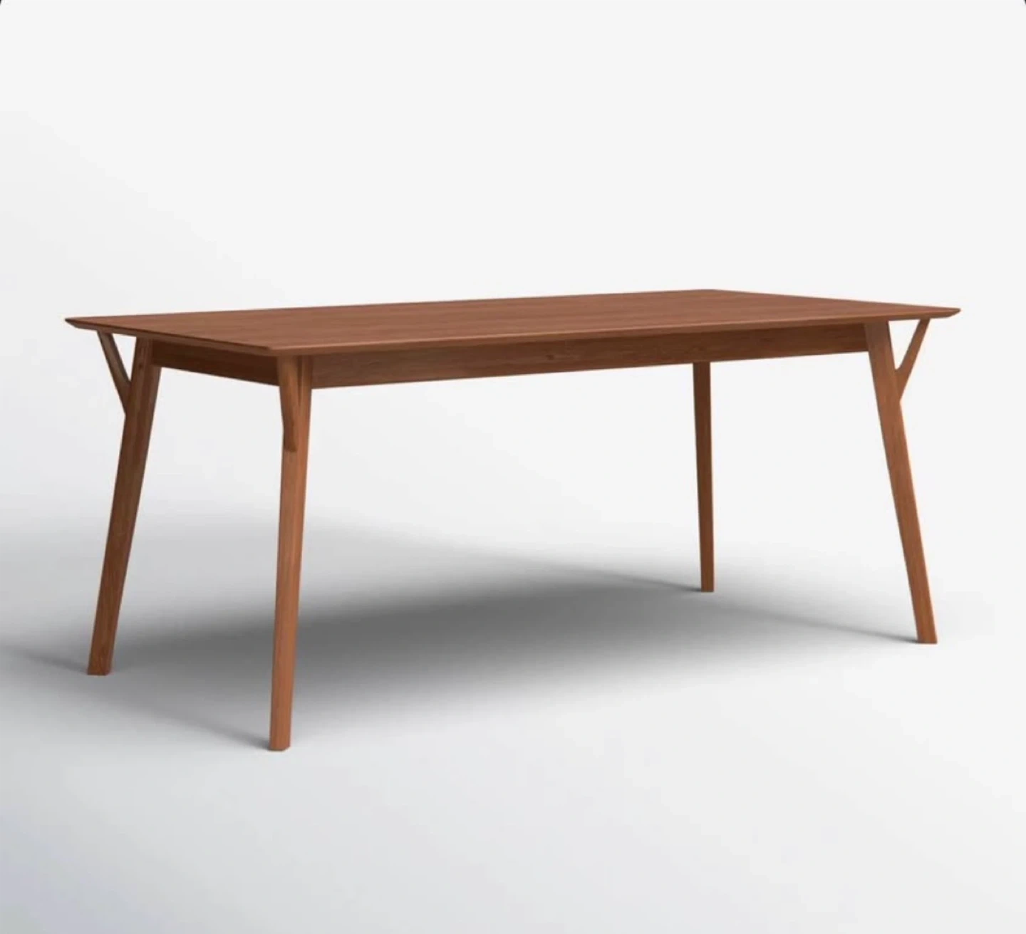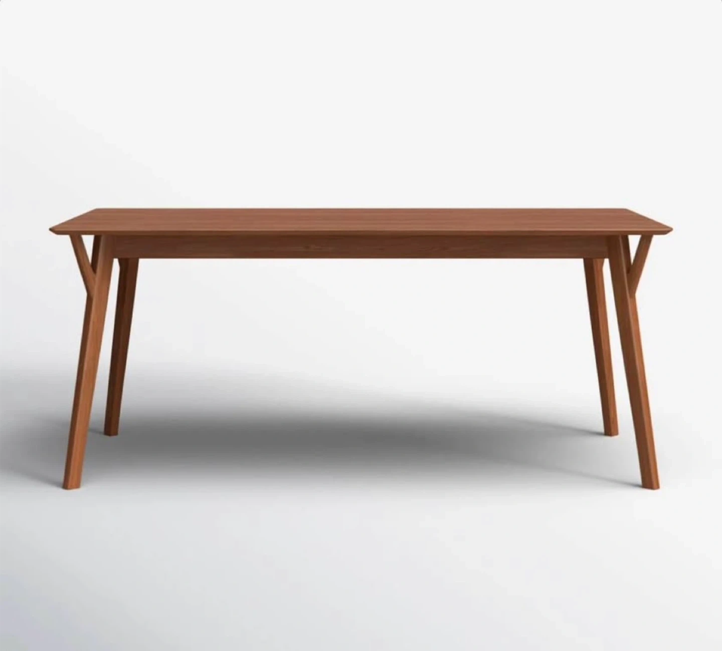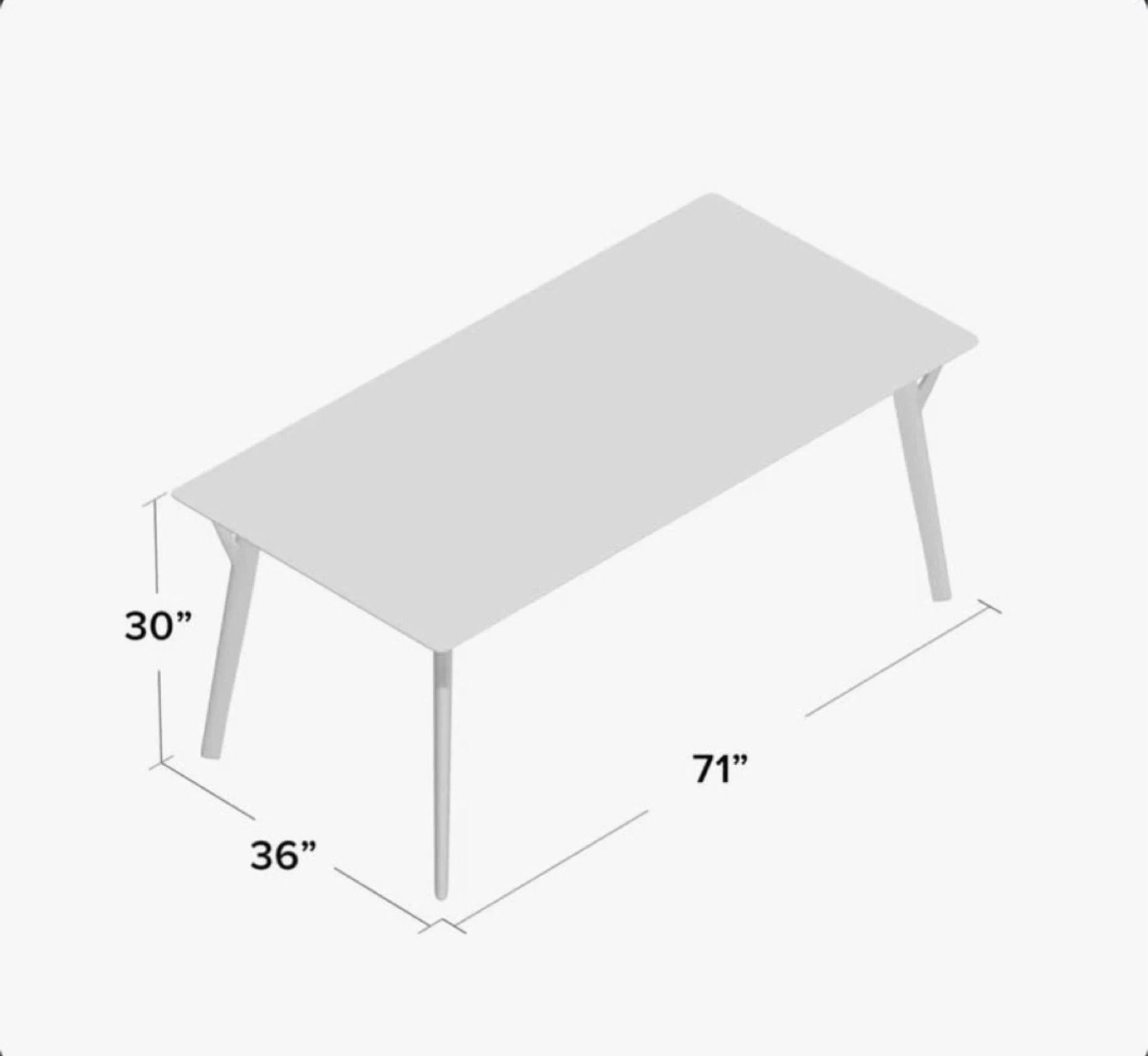 This dining table measures 71 inches long by 36 inches wide and stands 30 inches tall. It's crafted from solid wood with a warm finish. Seats up to 6 people comfortably.