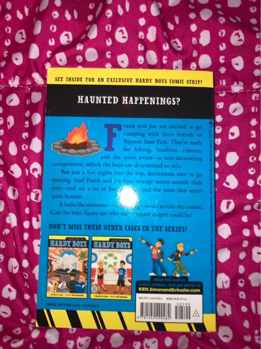 This is The Hardy Boys book "Camping Chaos", number 16 in the Secret Files series. It's written by Franklin W. Dixon and illustrated by Scott Burroughs. Included inside is an exclusive Hardy Boys comic strip!