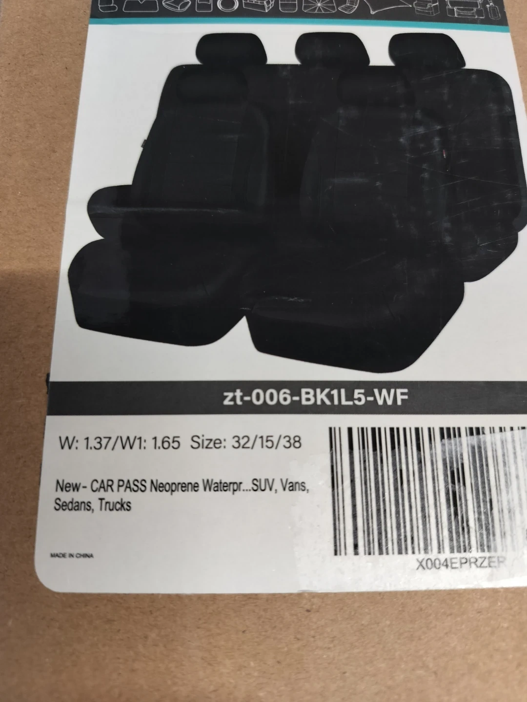 New CAR PASS seat covers. Made of neoprene and waterproof. Fits SUVs, vans, sedans, and trucks. Includes front seat covers with specified dimensions.