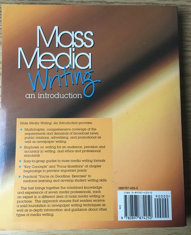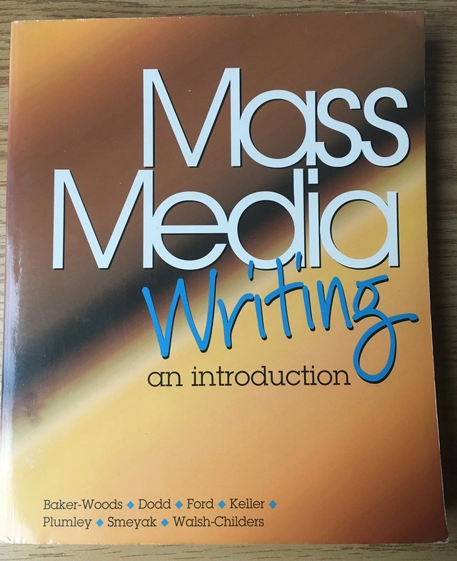 Mass Media Writing: An Introduction Paperback by Gail Baker-Woods, Julie E. Dodd, Kay Ford, Ken Keller. Publisher: Gorsuch Scarisbrick, Arizona, 1997. ISBN: 0897874250. Selling price: $20. Condition: Used - Like new. Cash accepted. Owner selling.
