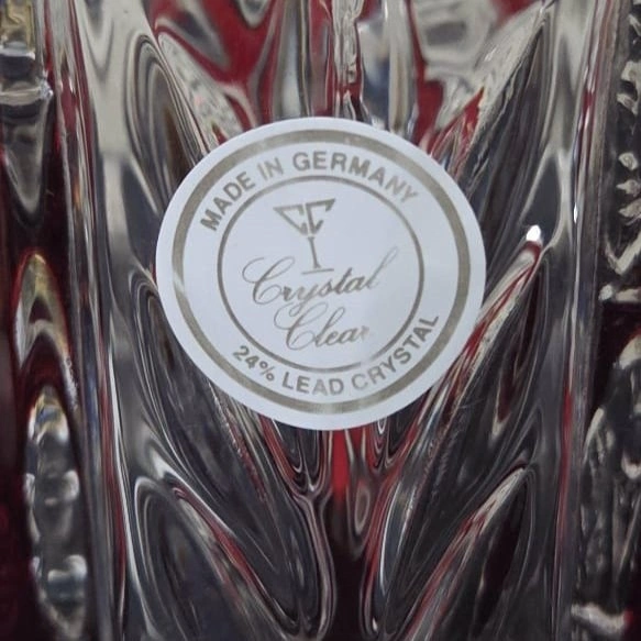 Beautiful high-quality German lead crystal vase featuring a deep ruby red overlay and classic cut-to-clear floral and geometric patterns. This style is inspired by traditional German and Bohemian crystal work, known for its weight, clarity, and brilliant sparkle. The vase still has its original label: “Made in Germany – Crystal Clear – 24% Lead Crystal.”
