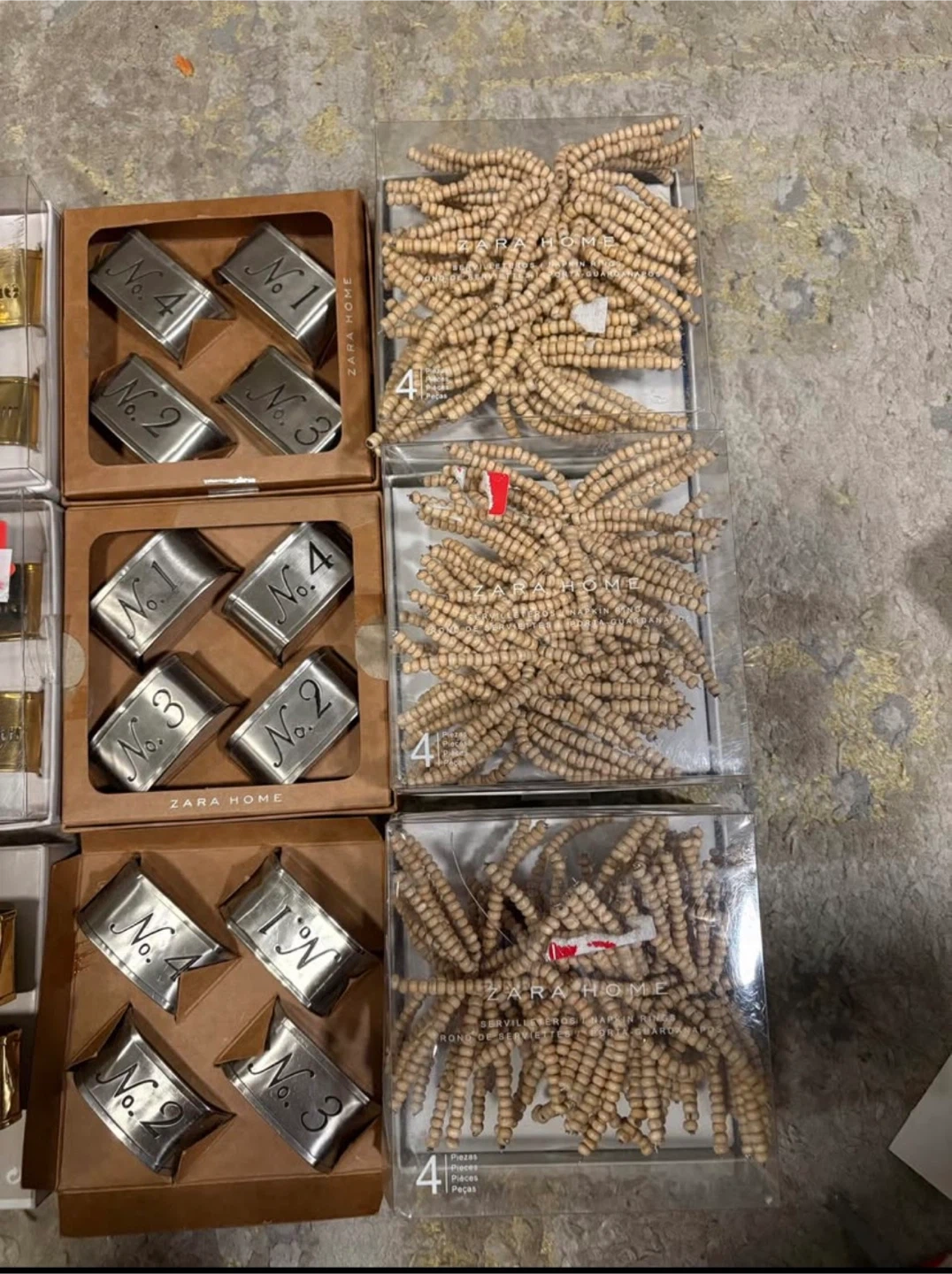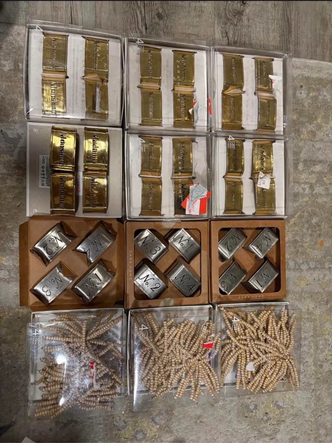 Bundle of Zara Home napkin rings and decorative beads. Includes gold-tone napkin rings with 'Madame' and 'Monsieur' inscriptions, silver-tone napkin rings numbered 1-4, and wooden bead garlands. Some items are in original packaging.