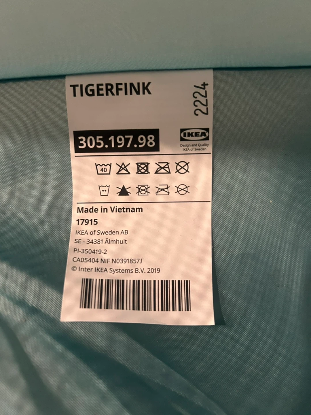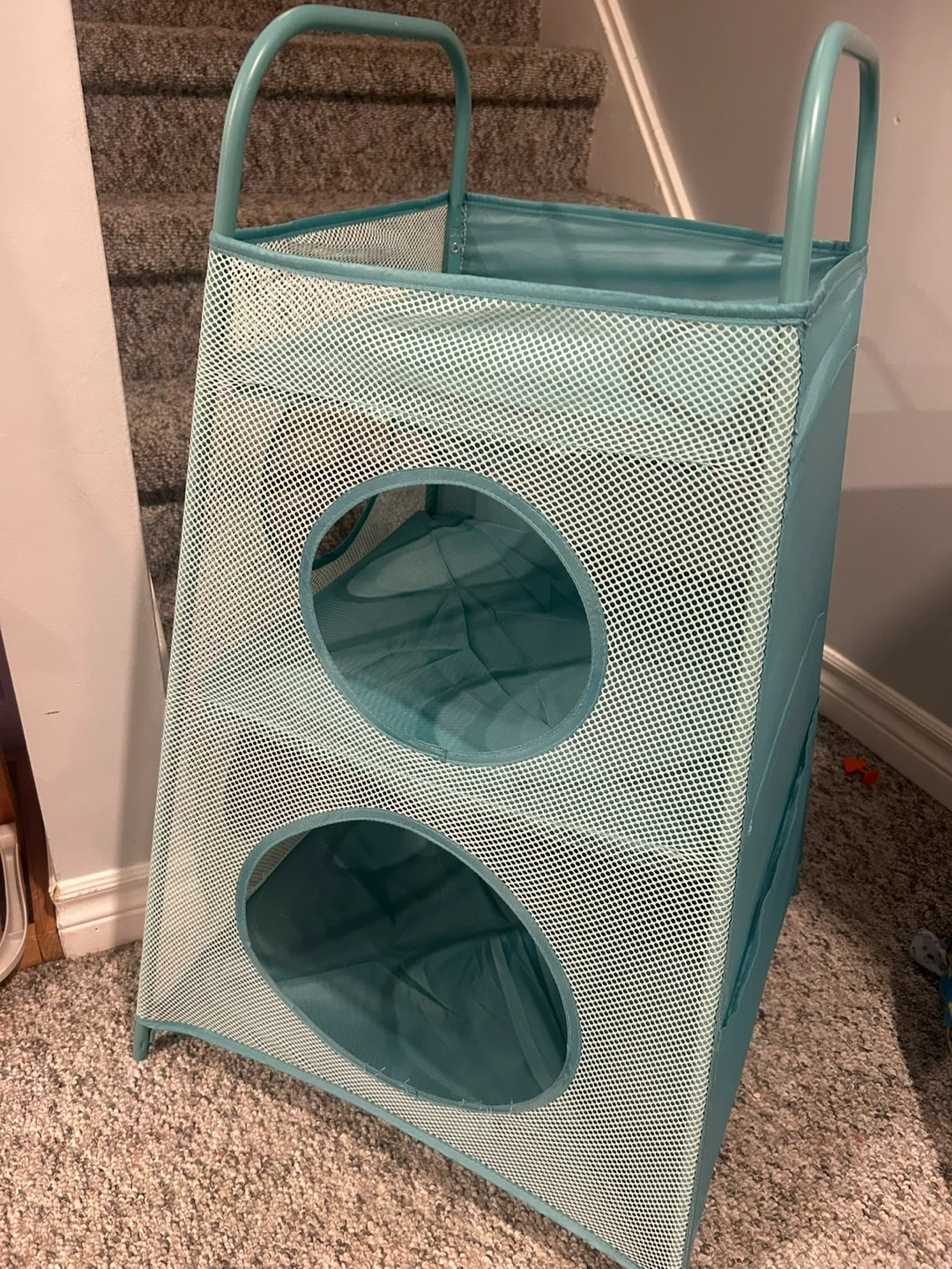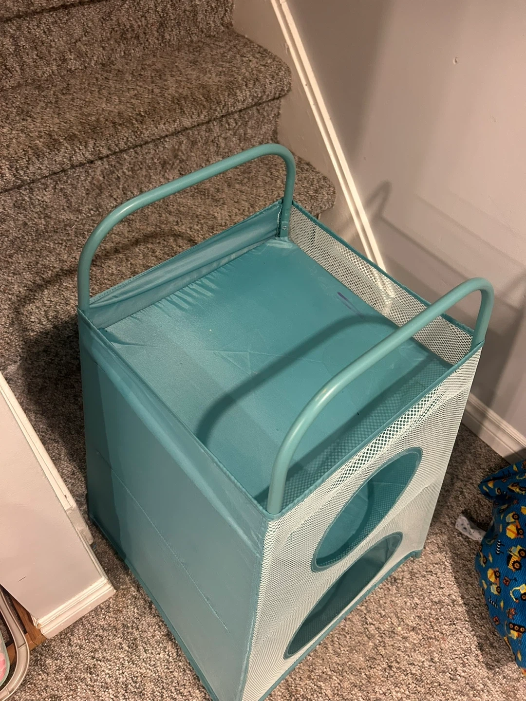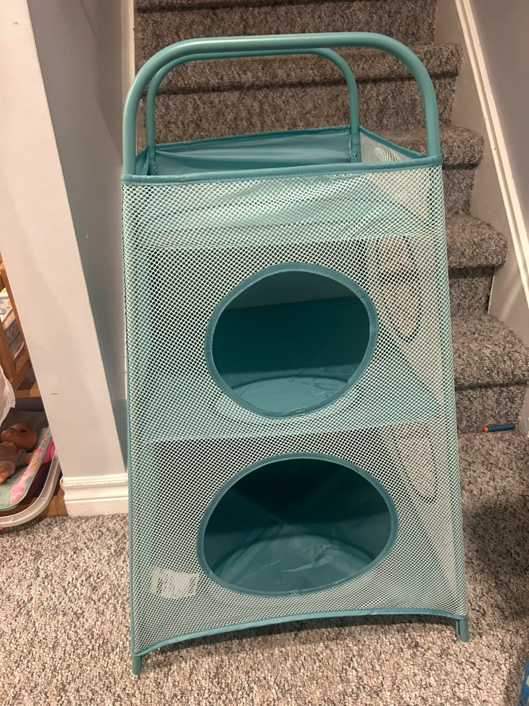 This IKEA TIGERFINK storage unit is teal with two open compartments. It's made with metal and fabric mesh. Measures 15.75" x 15" x 24.75".