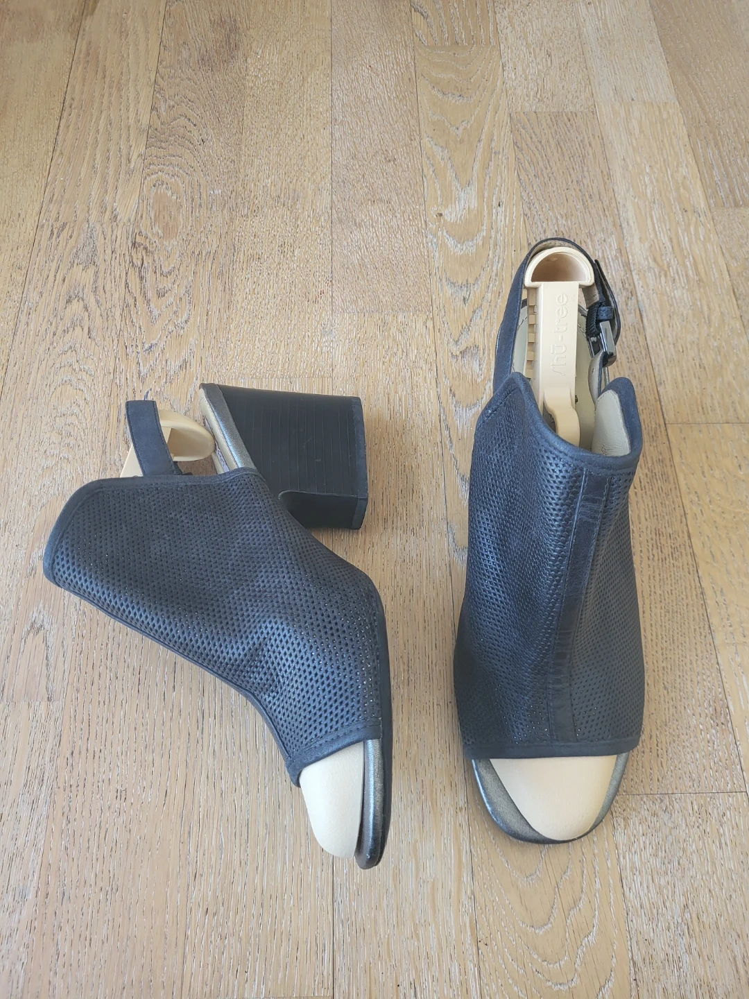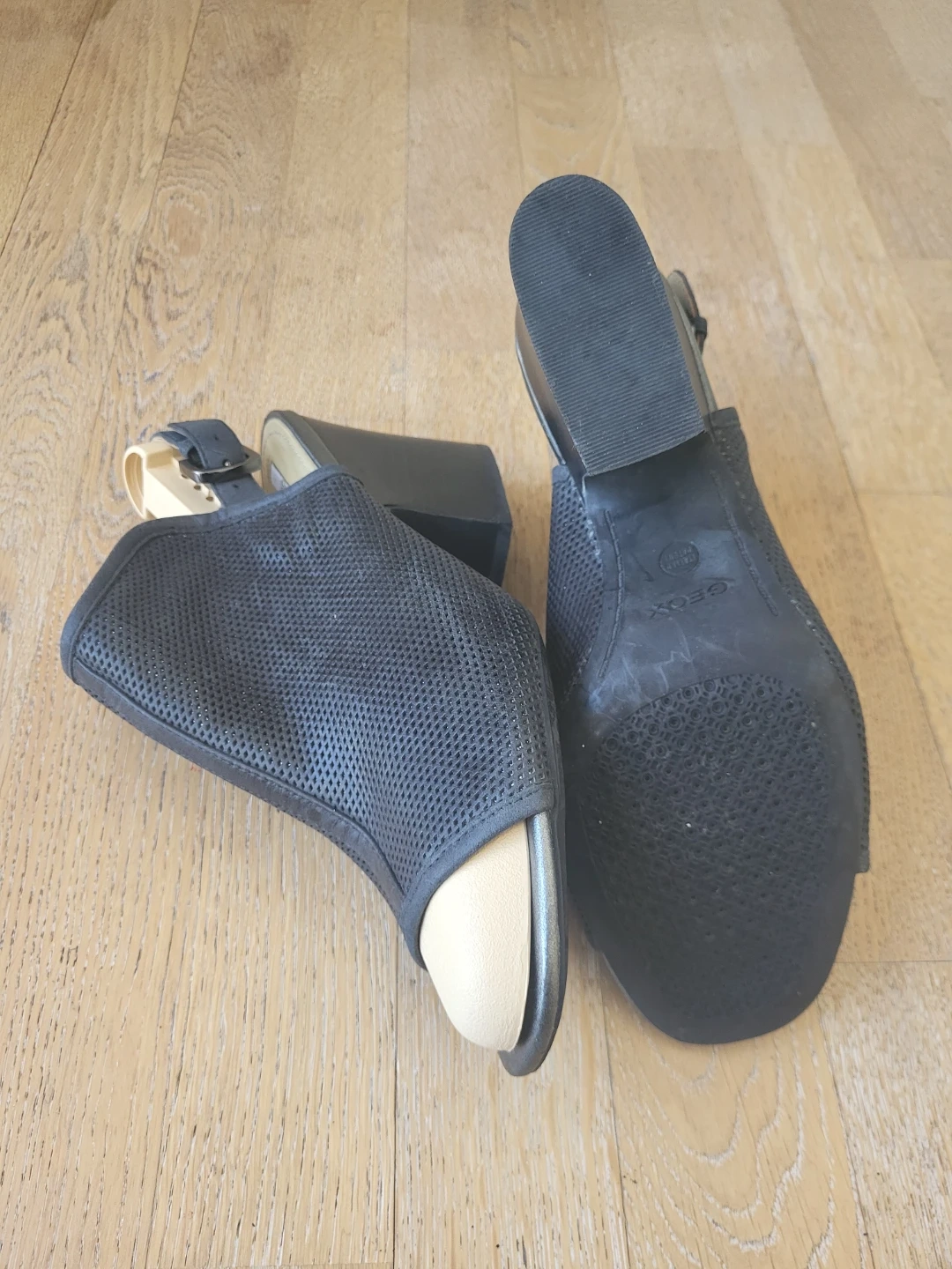 These Geox heeled sandals are a stylish black with a perforated design. They feature a comfortable block heel. Perfect for dressing up any outfit! Size 39.5