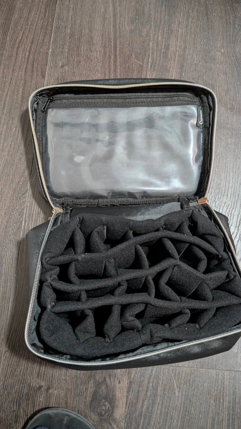 This Curmio toiletry bag is black and made of faux leather. It has multiple compartments inside to keep your items organized. There's also a zippered mesh pocket inside the lid. It's great for travel!