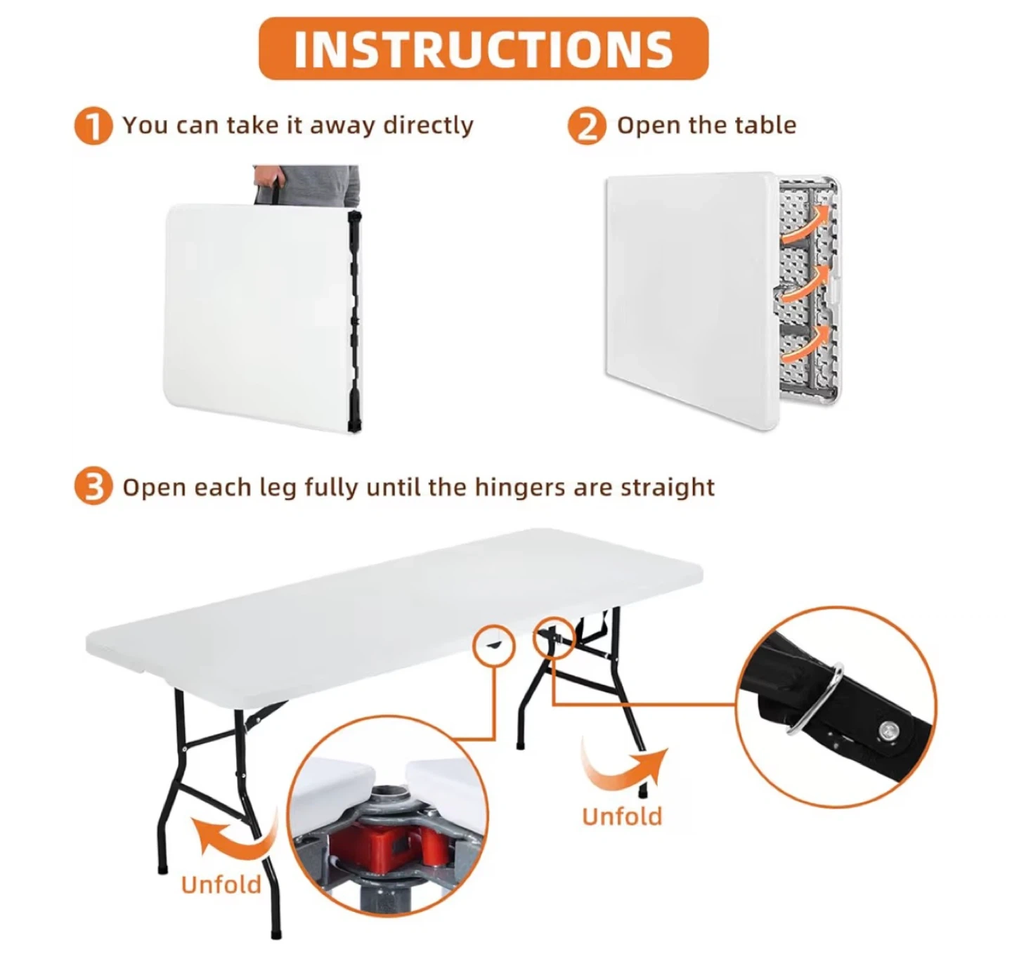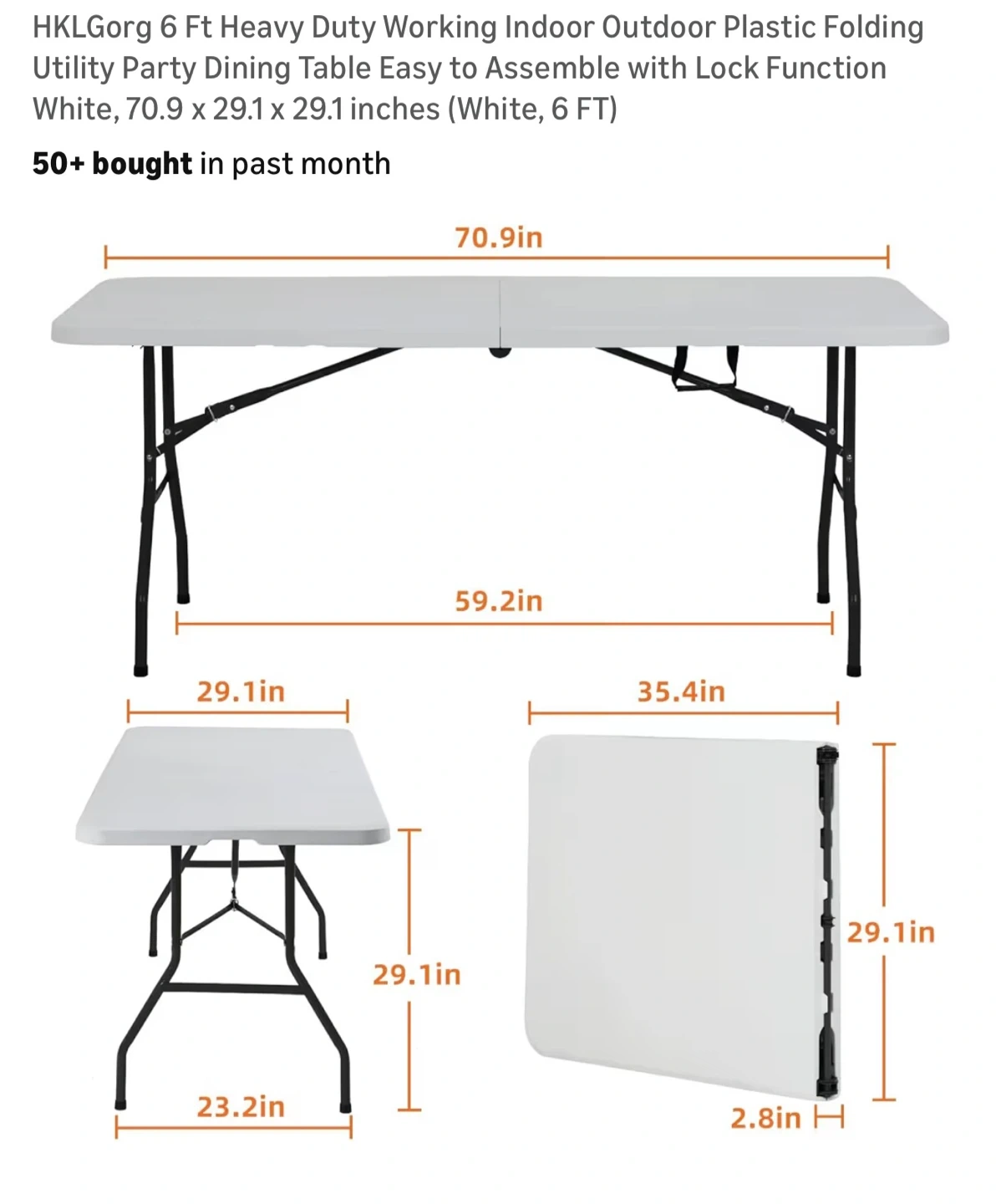 This is a HKLGorg 6 ft heavy duty folding utility table. It's made of white plastic and has a lock function. Dimensions are 70.9 x 29.1 inches when open, and it folds to 29.1 inches in height and 2.8 inches in depth.