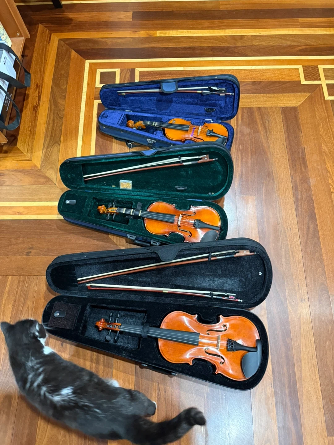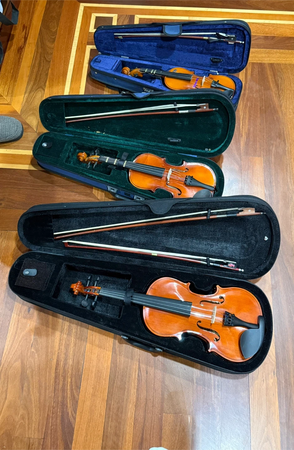 Three violins are included, each in its own case with a bow. The cases are blue, green, and black. Perfect for aspiring musicians or a music class!
