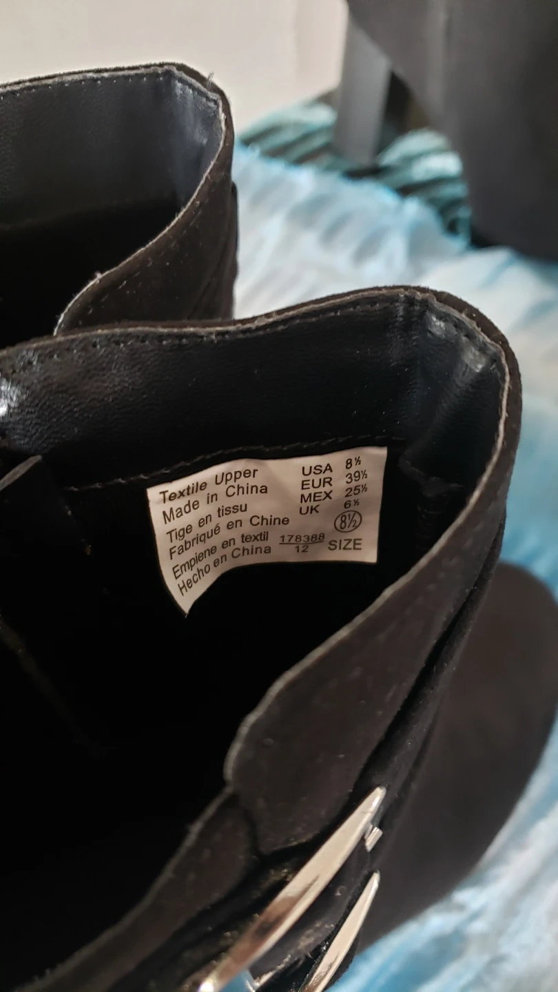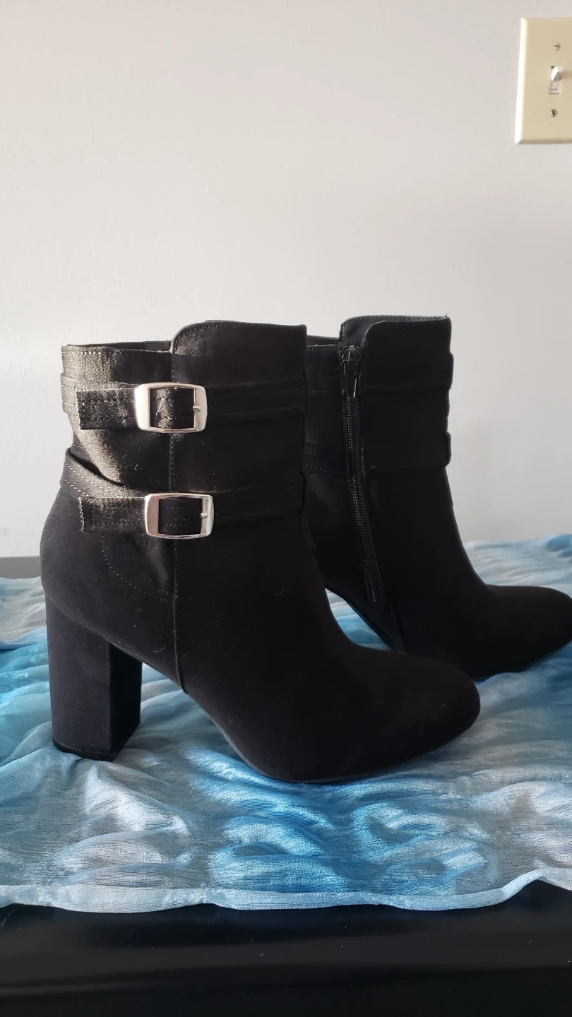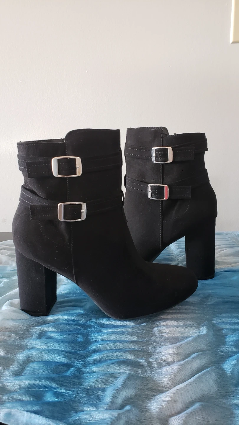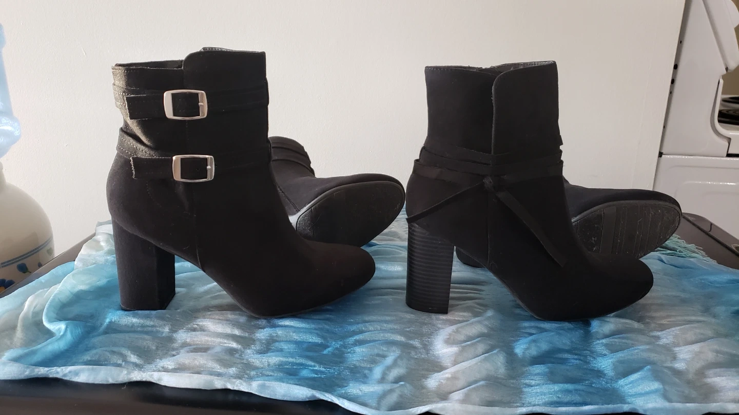 Beautiful and sexy black faux suede ankle boots. Worn once or twice each so in excellent condition, no scuffs or marks. Boots with silver toned buckles are size 8.5 but fit more like a 7.5/8, approx 3 inch chunk heel. Boots with ribbon detail are size 8 but fit like a 7.5/8, also approx 3 inch chunk heel. Both very comfortable and the chunk heel is easier on the knees, and great ankle support. $40 for each pair, or buy both for $70. These are really nice boots!