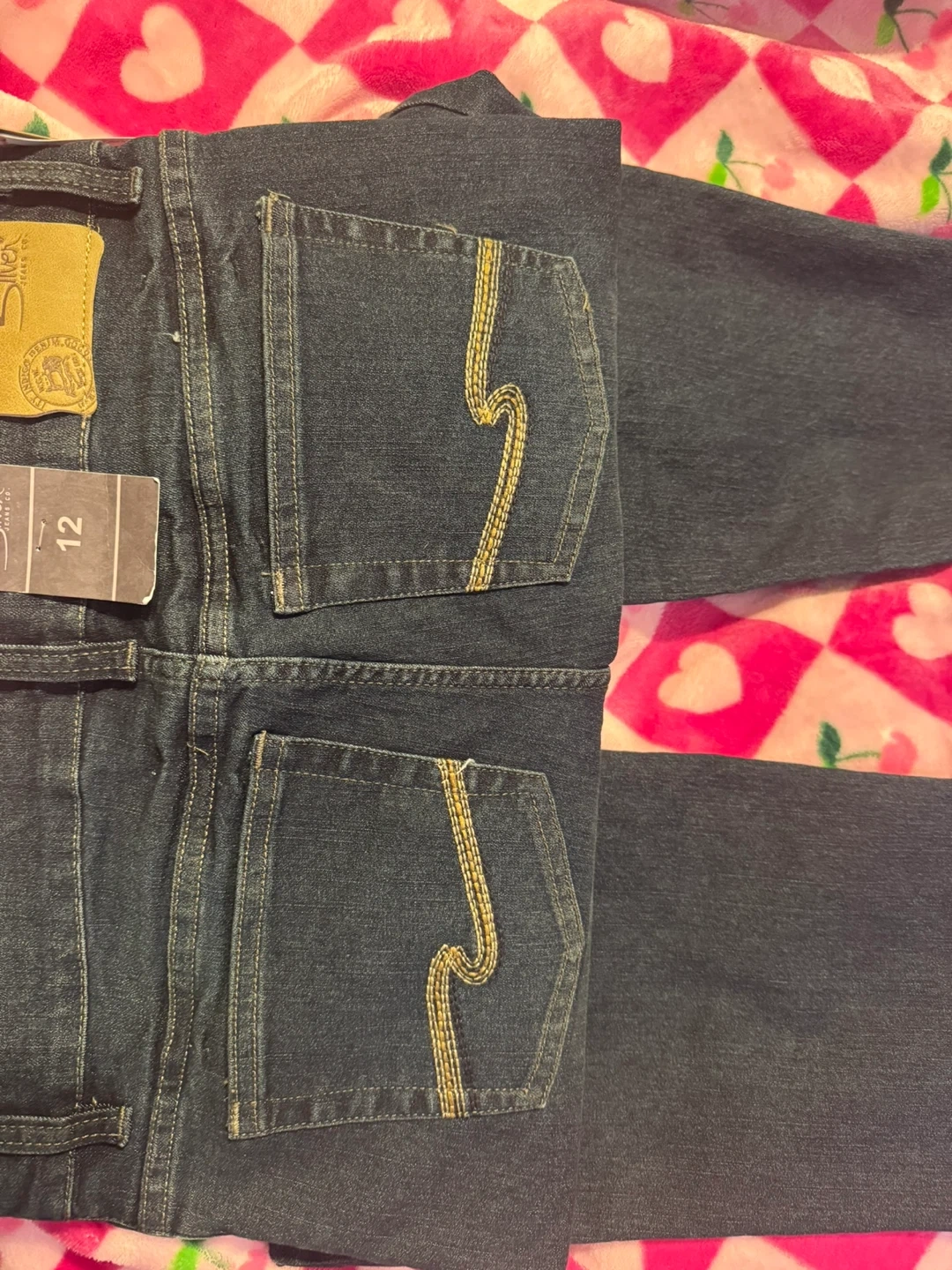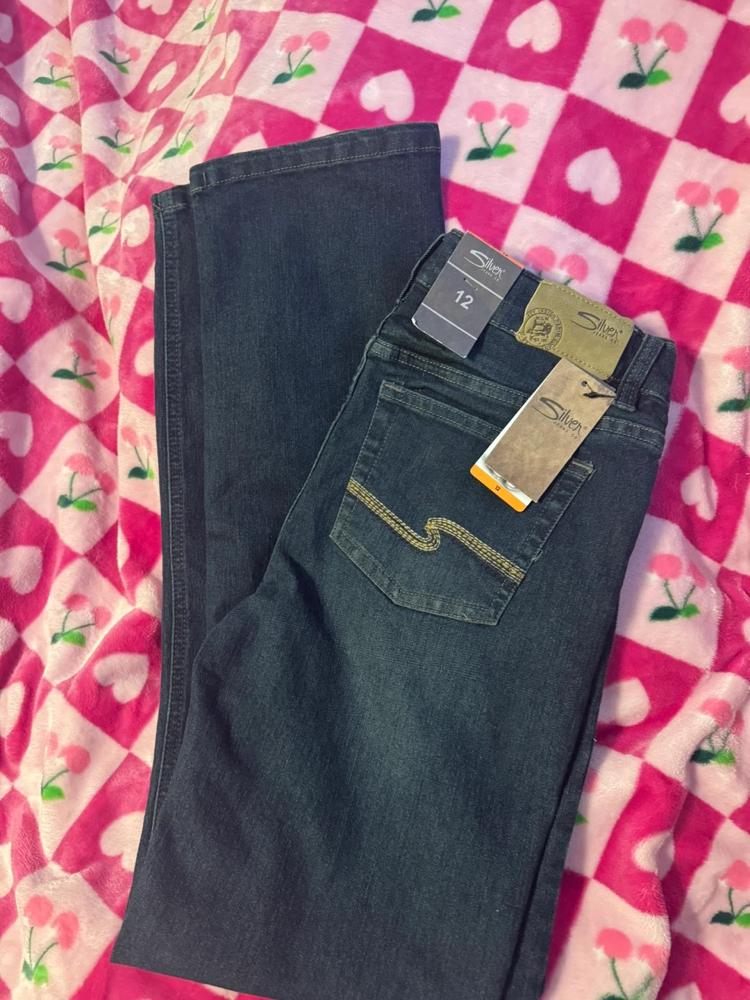 Brand new Silver Jeans Co. bootcut denim jeans. Dark wash, size 12. These jeans feature decorative stitching on the back pockets. A classic style that's easy to pair with boots!