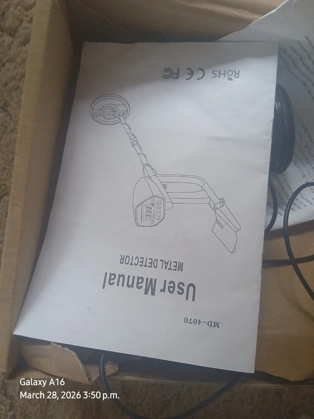 It's a metal detector with a collapsible shovel and headphones. The user manual is included. This detector is suitable for finding buried treasures!