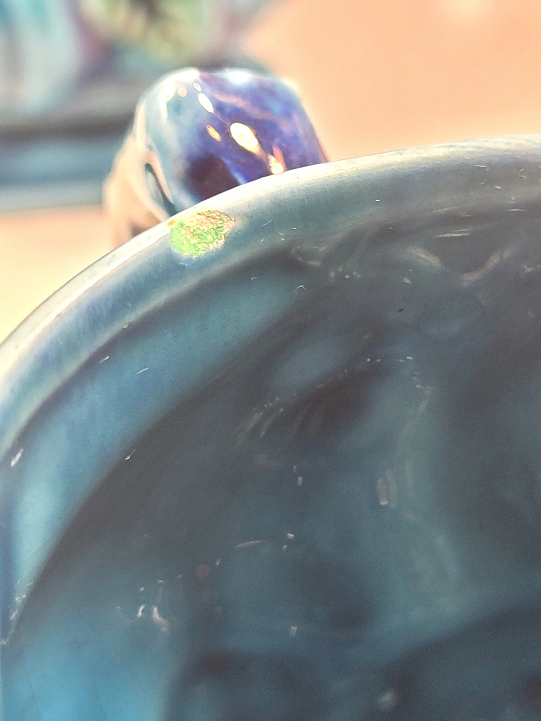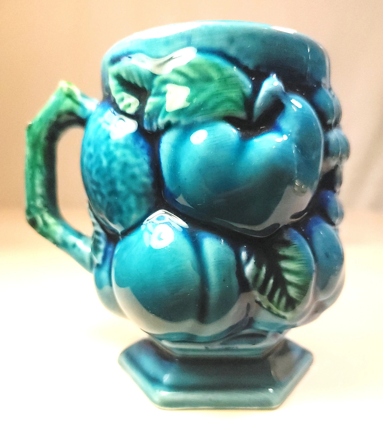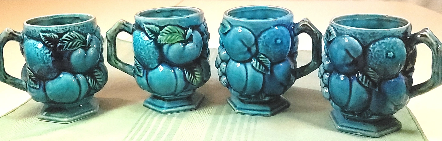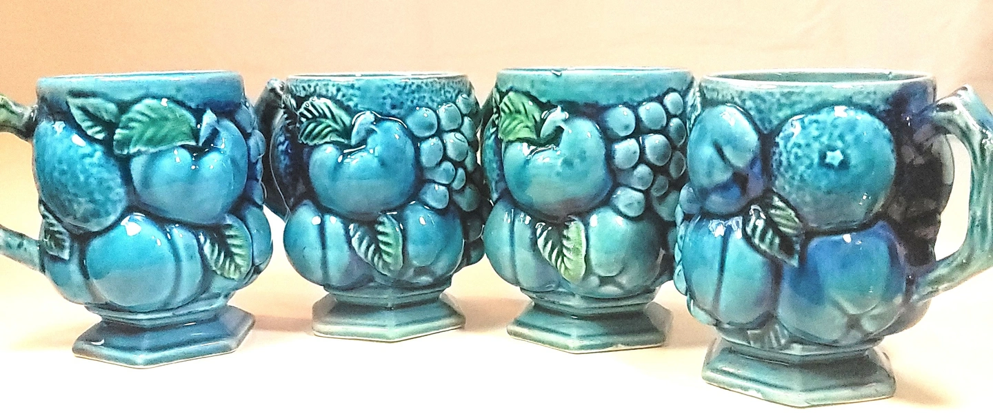Elevate your home with this authentic, mid-century set of four "Mood Indigo" mugs by Inarco, Japan. Renowned for their vibrant, high-gloss indigo blue glaze and intricately detailed, raised fruit-and-leaf relief pattern, these mugs are a classic example of 1960s Japanese ceramic export design. Each mug is marked with the iconic Inarco "G" in a wreath and model number E2431. Perfect for collectors of MCM (Mid-Century Modern) decor or anyone looking to add a touch of vintage character to their kitchen.