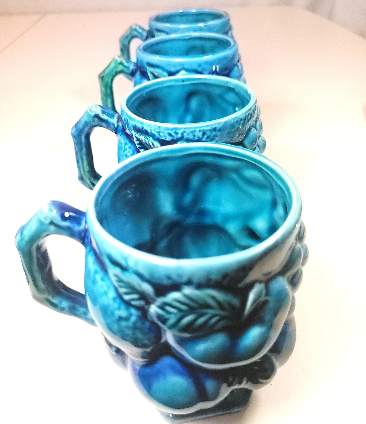 Vintage 1960s Inarco "Mood Indigo" Ceramic Mugs | E2431 Japan | Set of 4 Embossed Blue Fruit Mugs | Mid-Century Modern Kitchenware