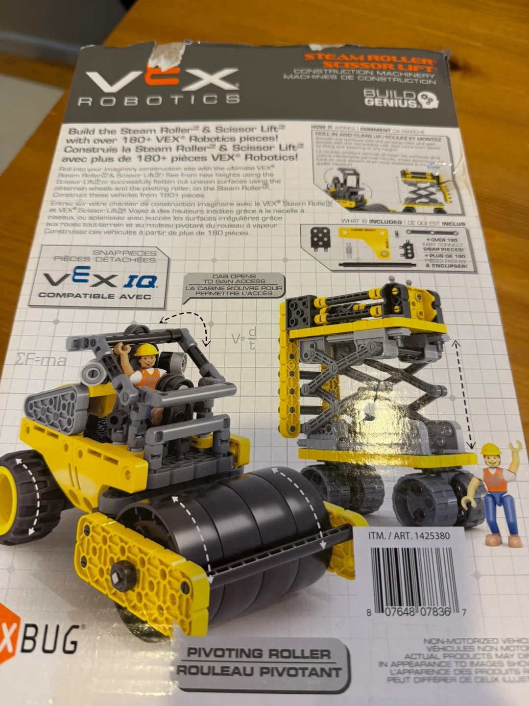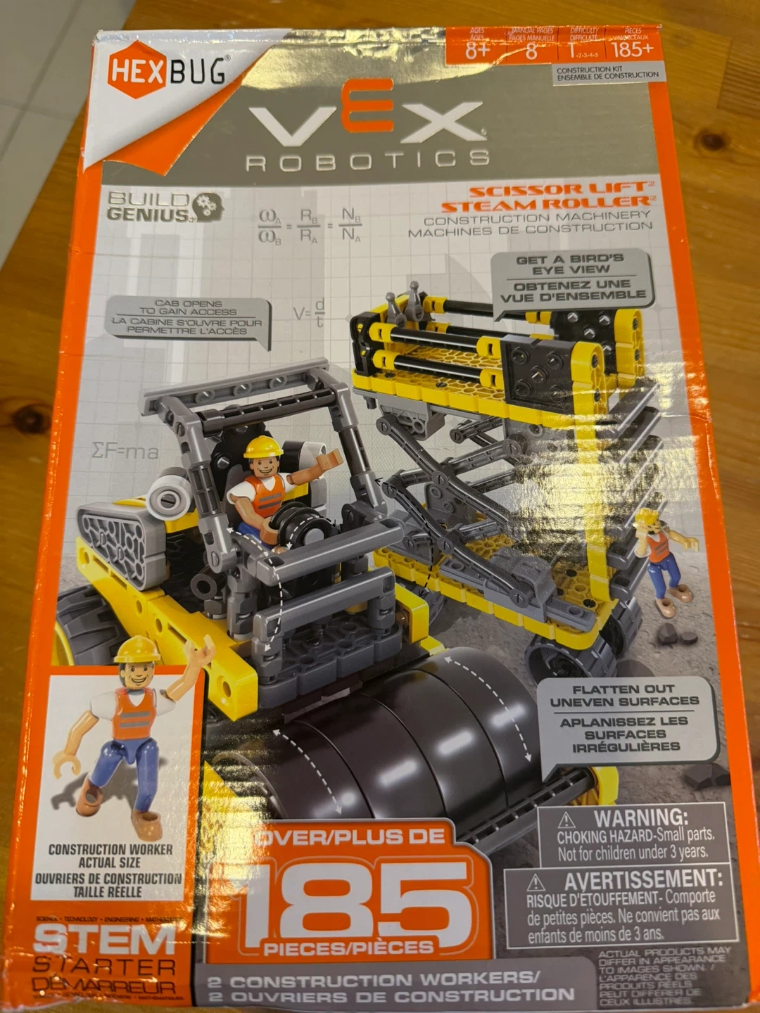 Build the VEX Robotics Steam Roller and Scissor Lift with over 185 pieces! This STEM starter kit includes two construction workers. It's designed for ages 8 and up, offering a fun way to explore construction and mechanics. Build these vehicles from over 180 VEX Robotics pieces! Brand new in box.