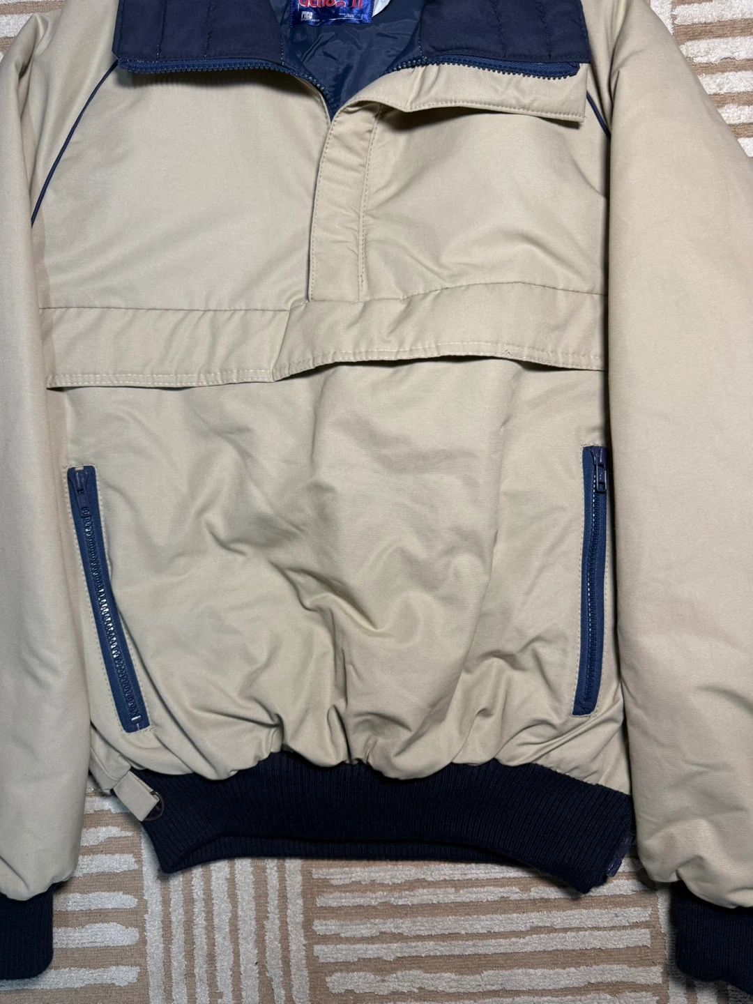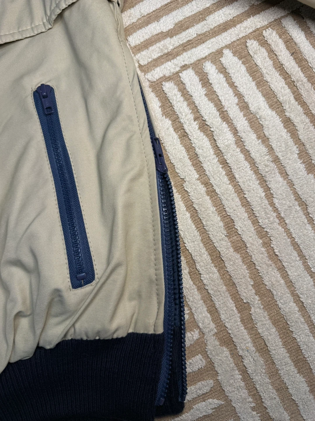 Cozy and durable puffer jacket. Beige body with dark blue accents. Ideal for outdoor activities.