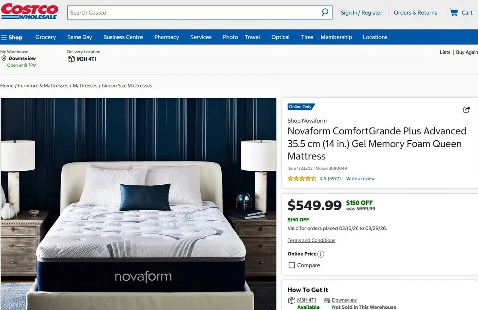 Brand new in the box. Novaform ComfortGrande Plus Advanced 14 in. Gel Memory Foam Queen Mattress. Regular price at Costco.ca is $700 + tax, asking only $380 (no tax).