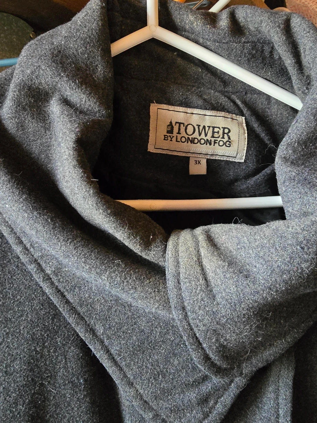 This peacoat from Tower by London Fog is a classic grey colour. It's a size 3X. Double-breasted button closure and a stylish collar. Made from a blend of materials, it's a warm choice for cooler weather.