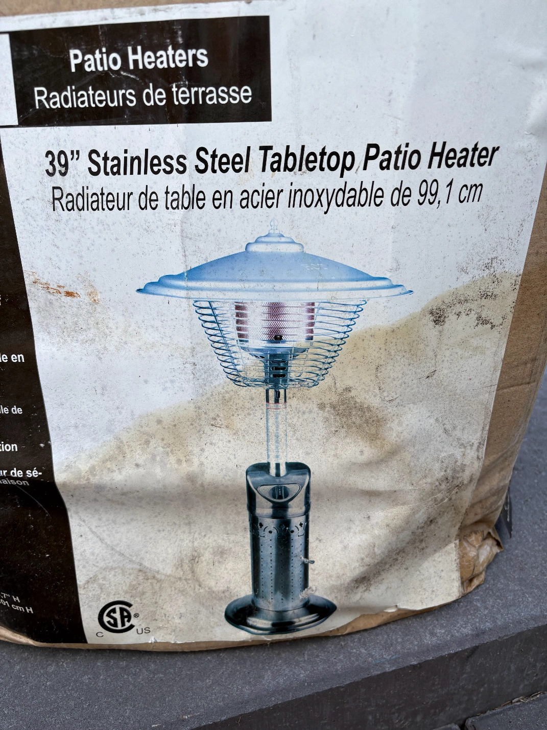 Selling a 39-inch stainless steel tabletop patio heater! It's still in its original packaging and ready to assemble. Perfect for extending those patio evenings a little longer into the cooler months
