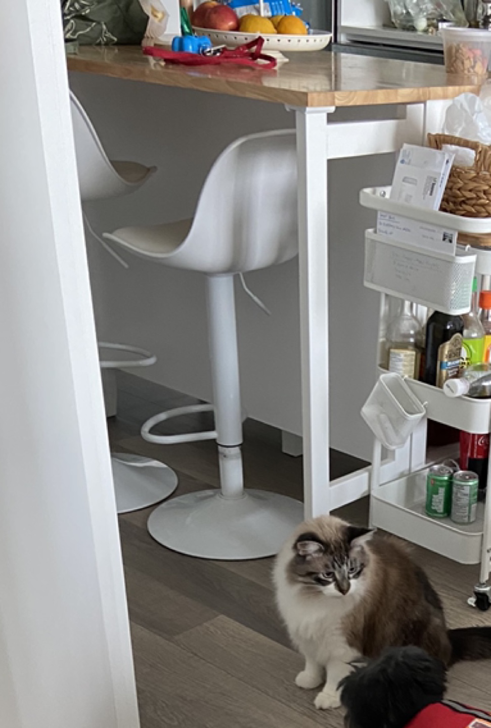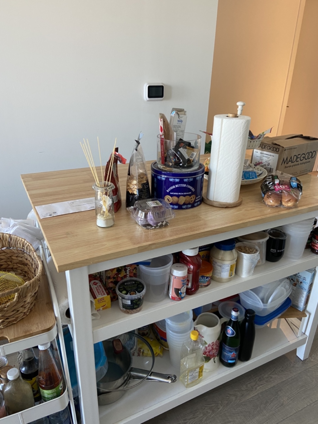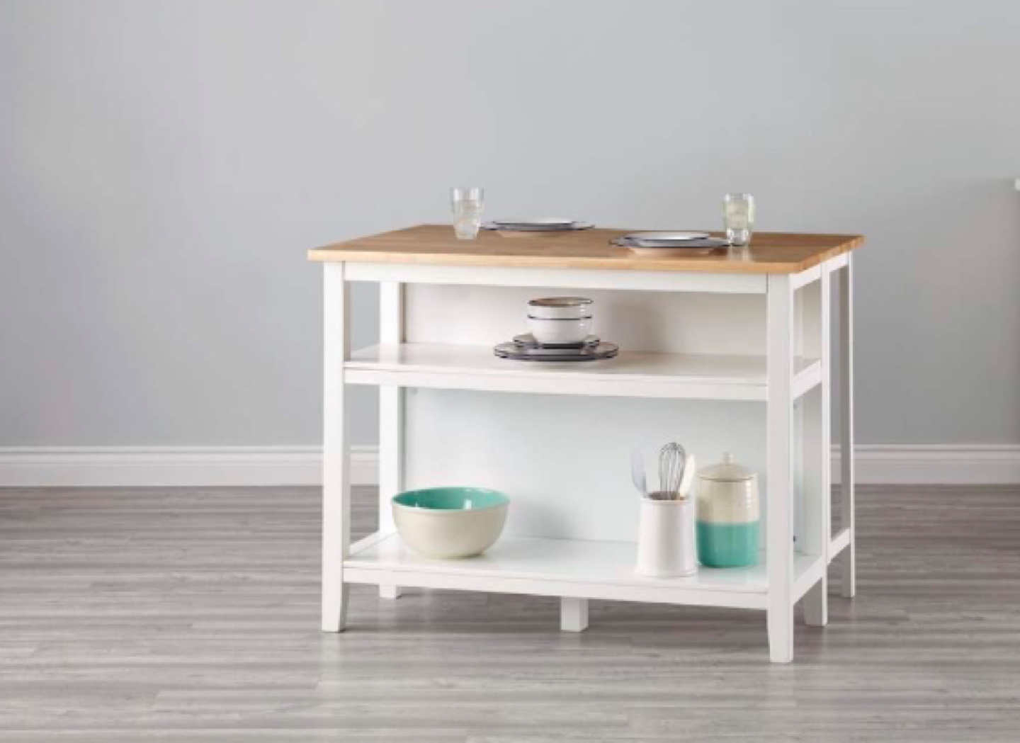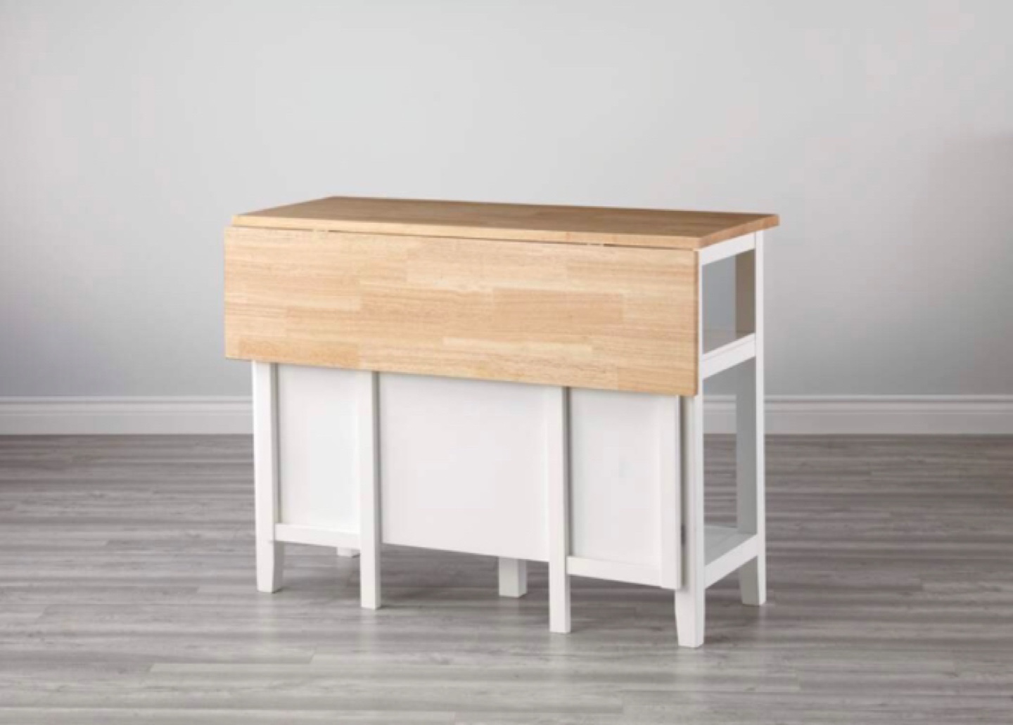 Kitchen island with butcher block top and two shelves. It has a pull-out extension to make it larger.