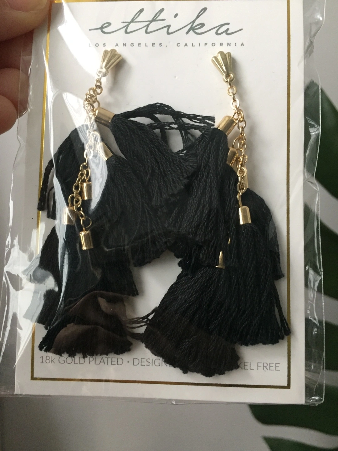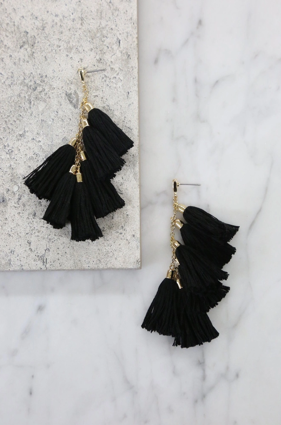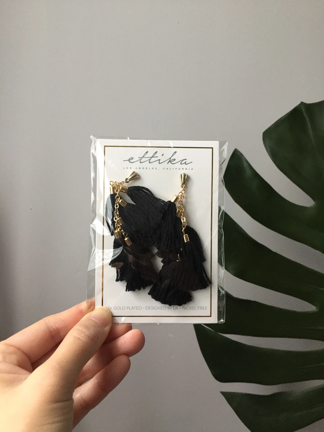 Black tassel earrings with gold accents. 18k gold plated and nickel free.