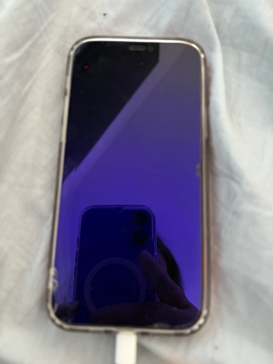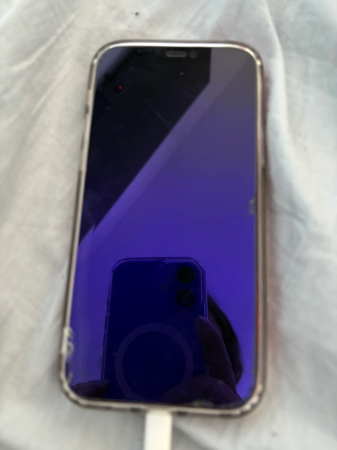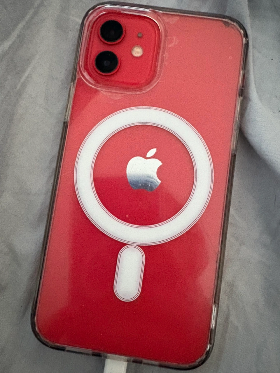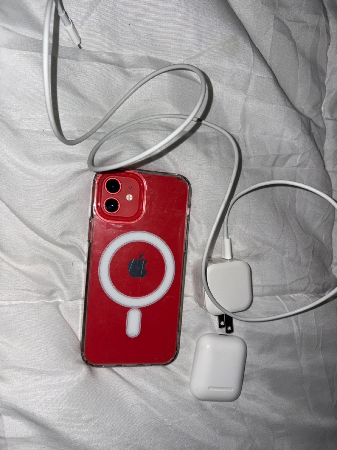 Red iPhone 12 with a clear case. The phone has a screen protector. It's charging in the pictures. Comes with Adapter & cable and wireless earbuds.
