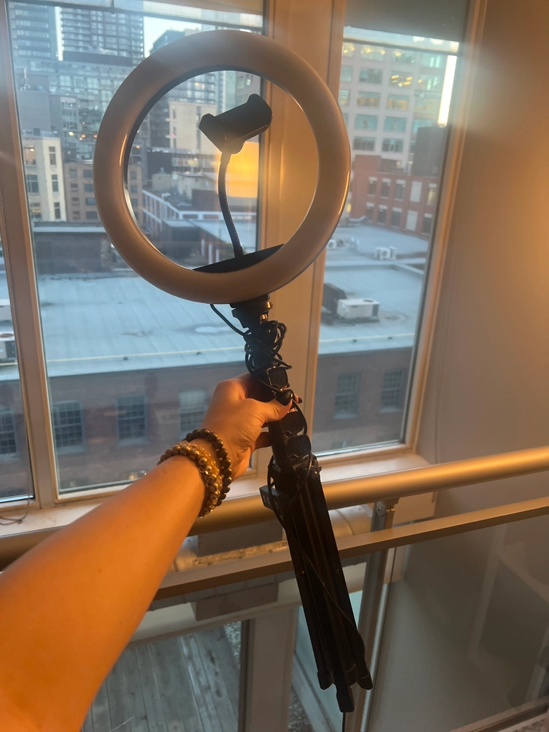Ring light with adjustable brightness and colour temperature, comes with phone holder and tripod stand. In good condition, rarely used. I’ve placed it beside my peloton so you can see how tall it can be at its tallest height.