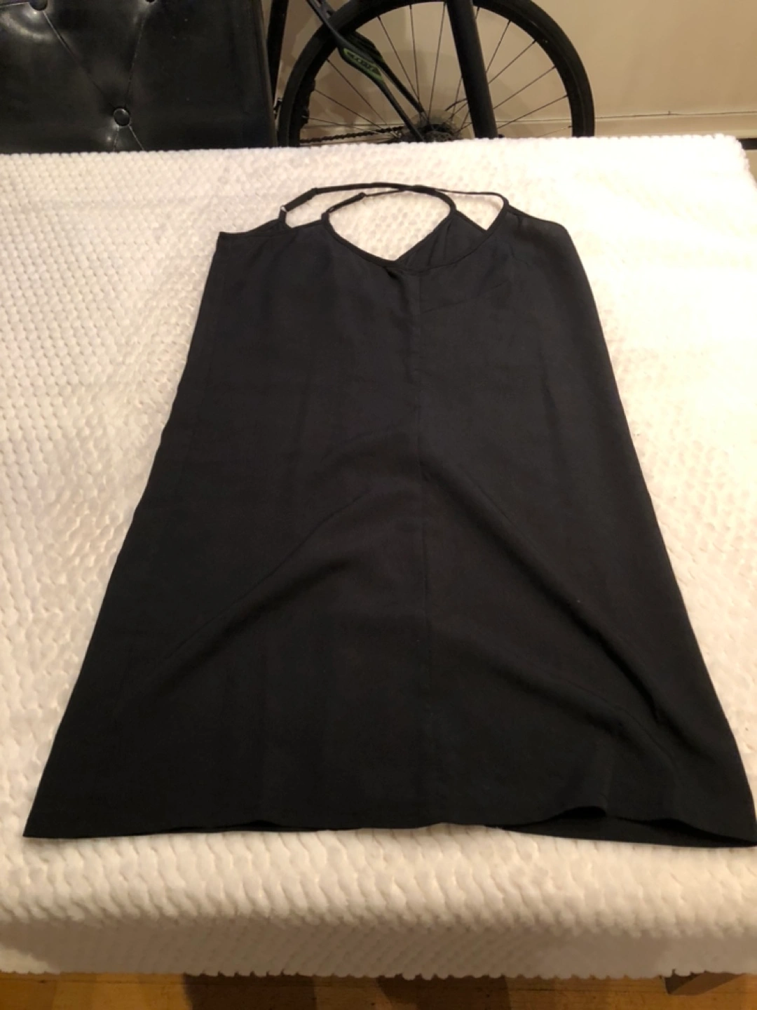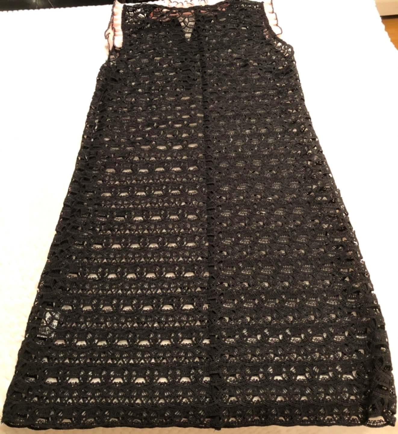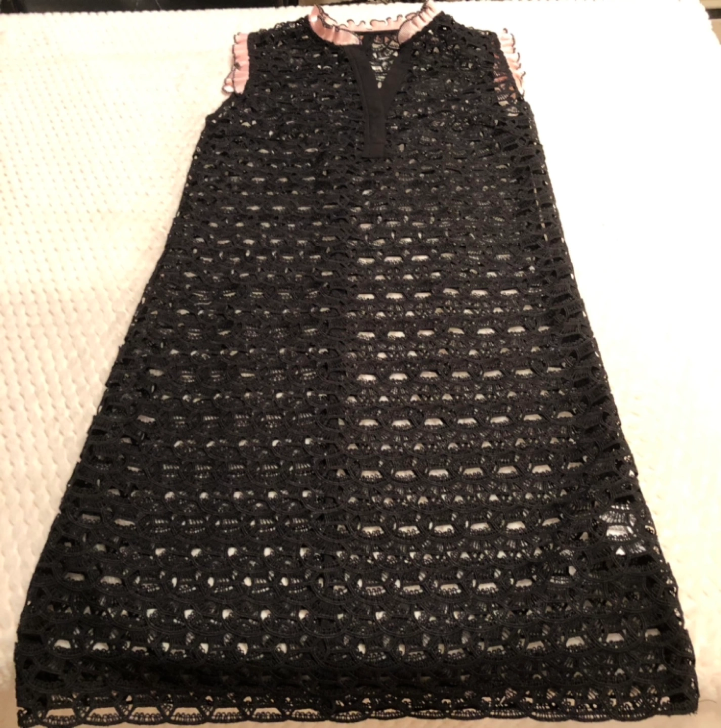 Black crochet dress with a v-neck and pink ruffles. The dress has a loose fit and hits above the knee. It is made of a delicate material. I’m not sure about the sizing - owner is 5’9” and 115 lbs. Located in Downtown Vancouver.