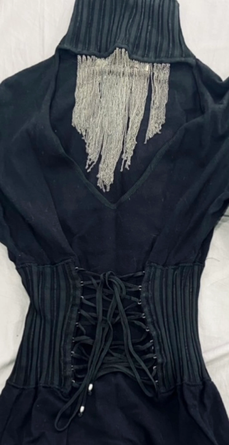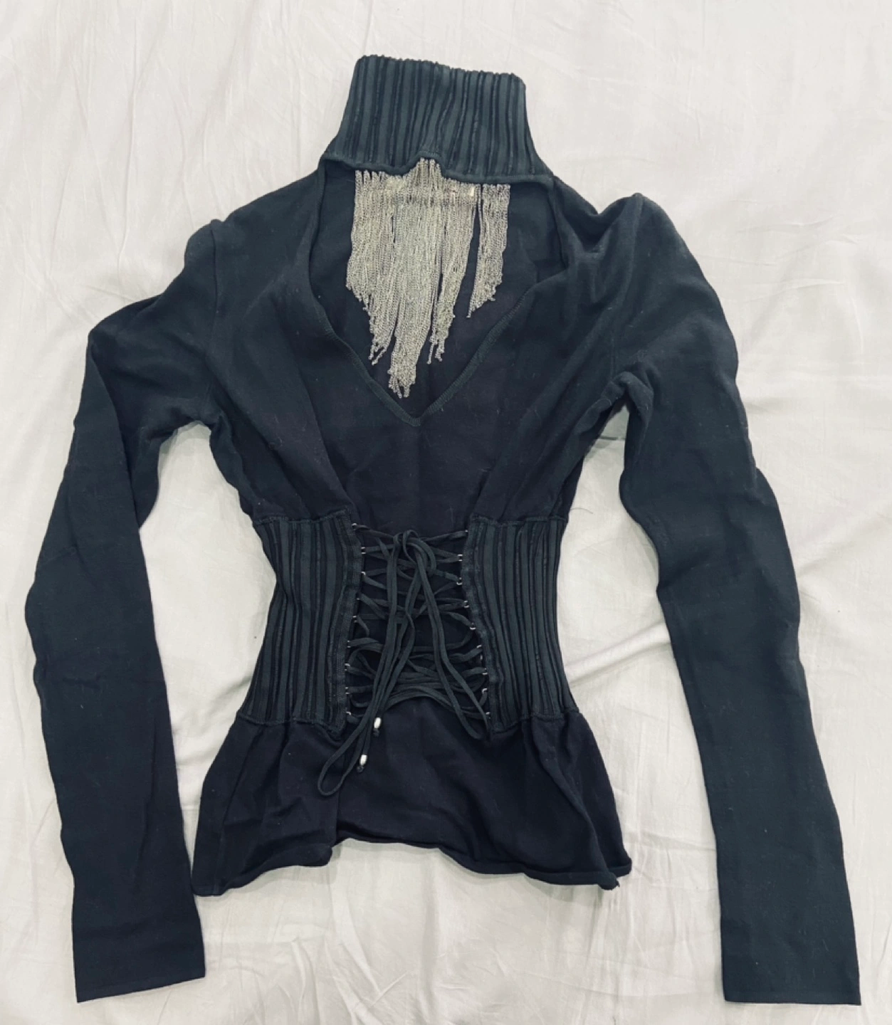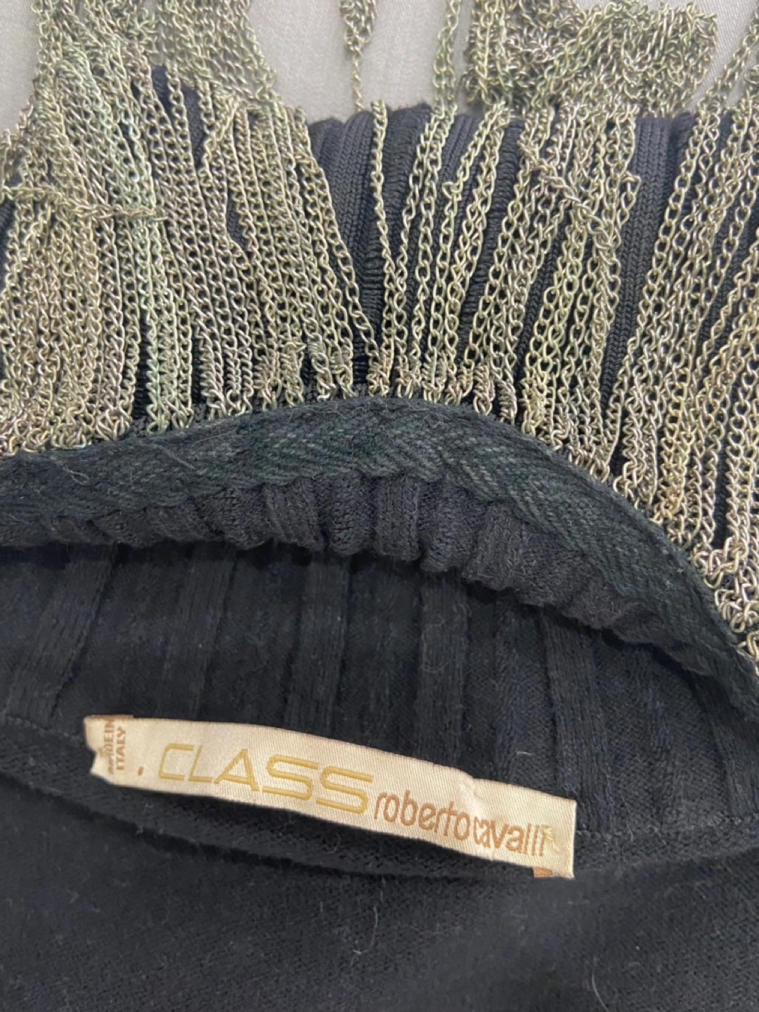 Class Roberto Cavalli black long-sleeved turtleneck sweater with a chain detail at the neckline and a corset-style bodice. It has a fitted silhouette. Made in Italy.