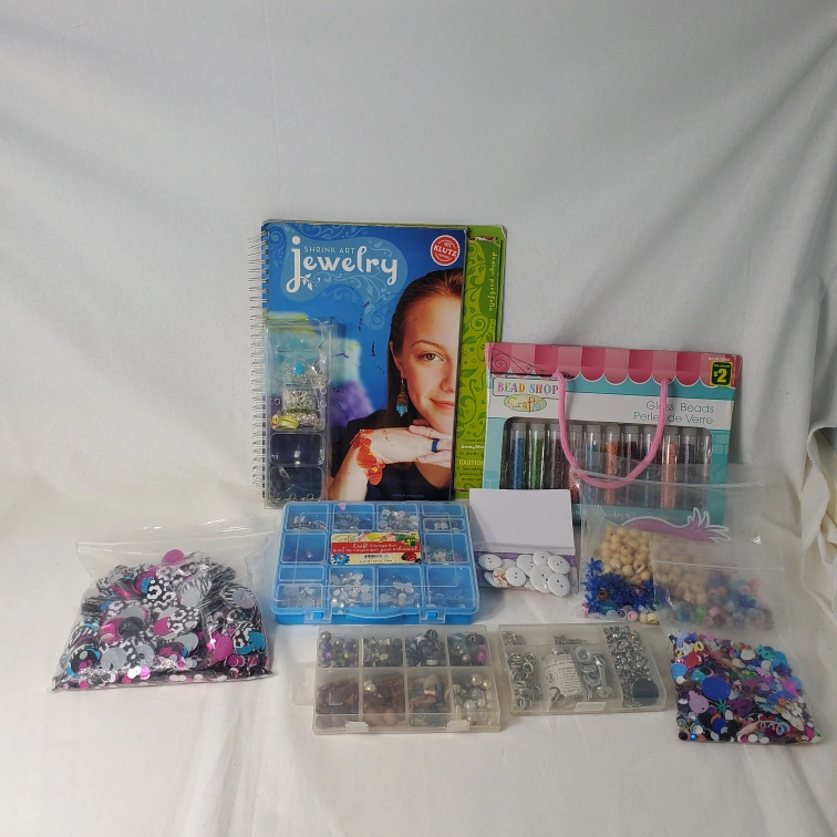 Large lot of craft supplies. Includes beads, buttons, sequins, and more. Perfect for jewelry making and other crafts. The jewelry book has different pieces you can make. There is wear on the book. Located northside.