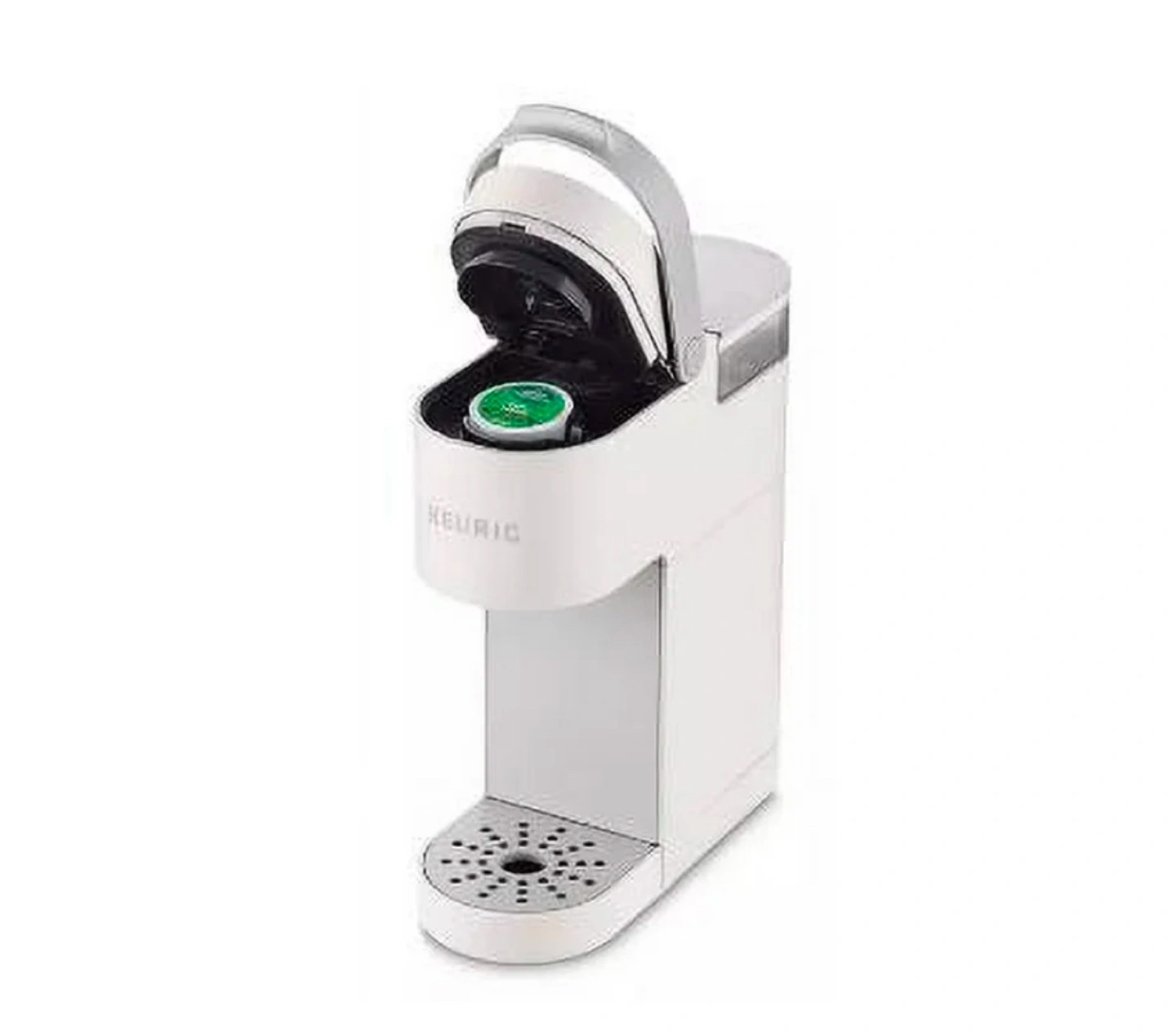 White single-serve coffee maker. Makes one cup at a time. Includes removable water reservoir.