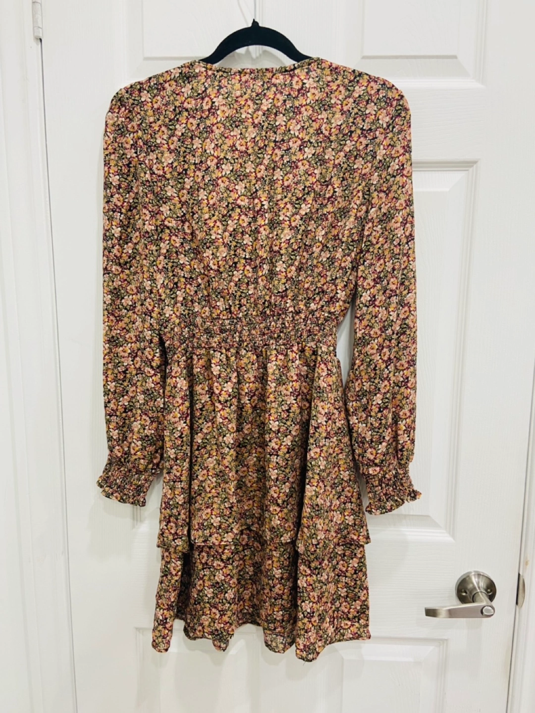 Long sleeve short dress with floral print.