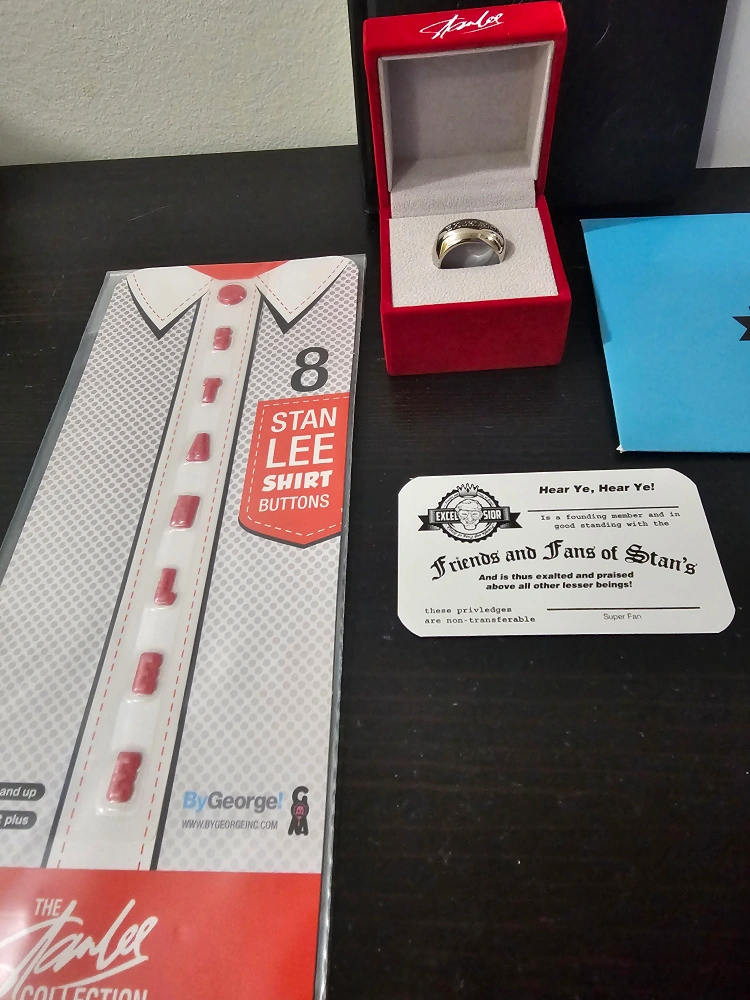 Stan Lee Collection set includes a ring, sketchbook, print, and a set of eight shirt buttons.