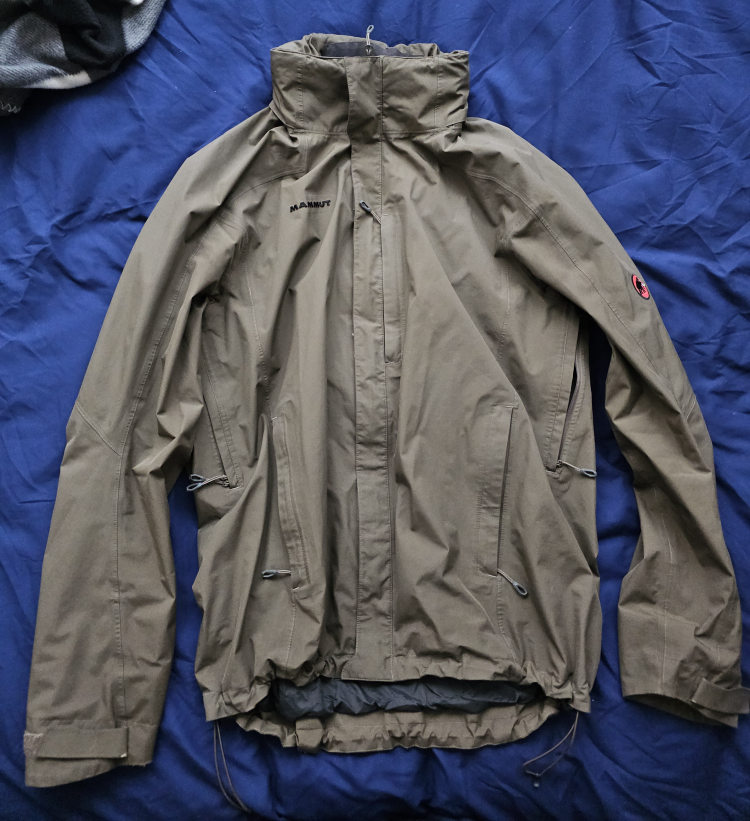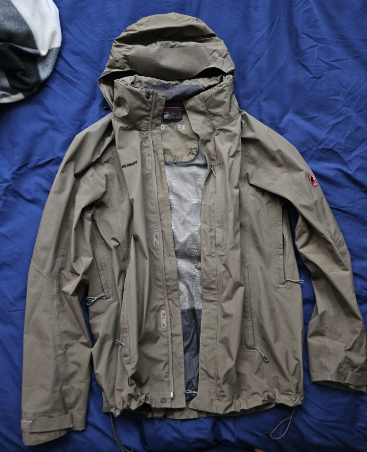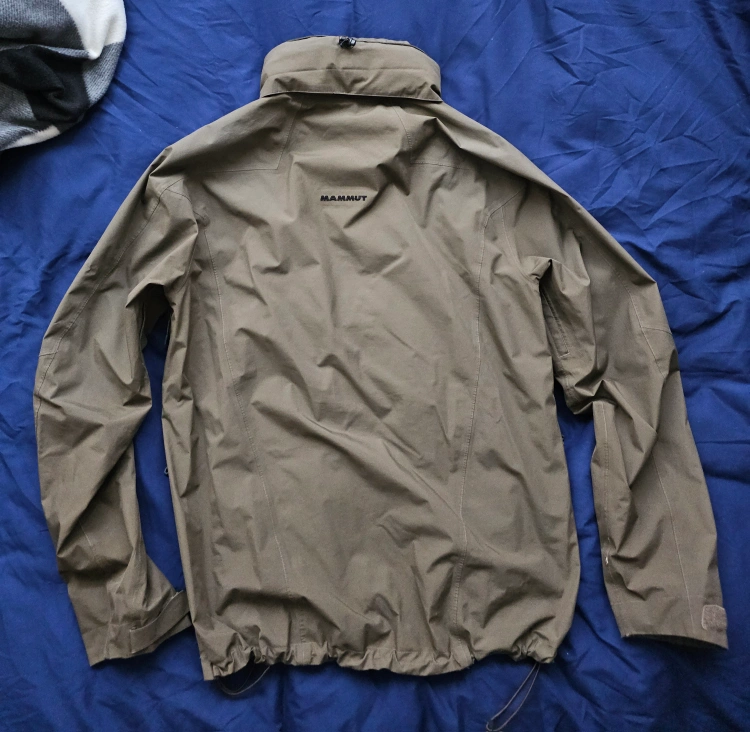 Brown Gore tex Paclite shell from Mammut in mens size L. Good condition, has a tiny rip on the right sleeve as seen in the picture. Will need to be retreated with a DWR to keep it water repellent. Has a removable, stowable hood. Measurements below