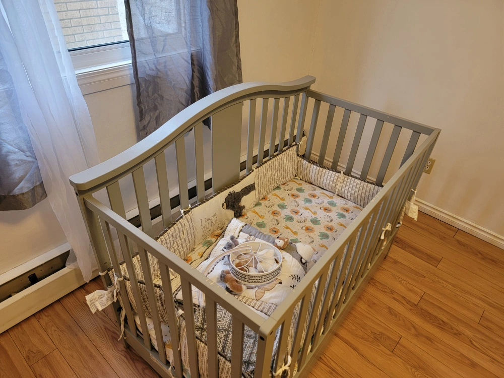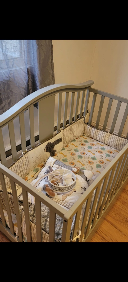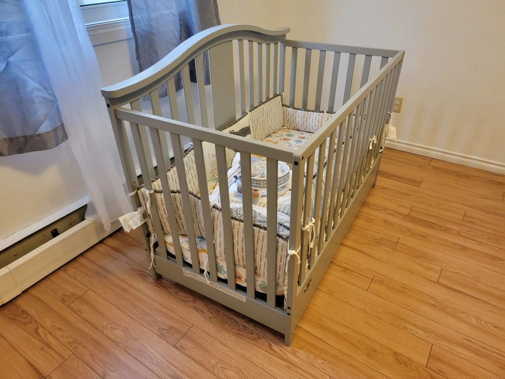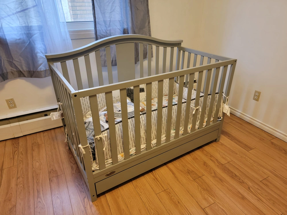 Grey crib with storage drawer. Very minor cosmetic wear and tear, but overall in good condition. Includes mattress and sheets/blanket etc.