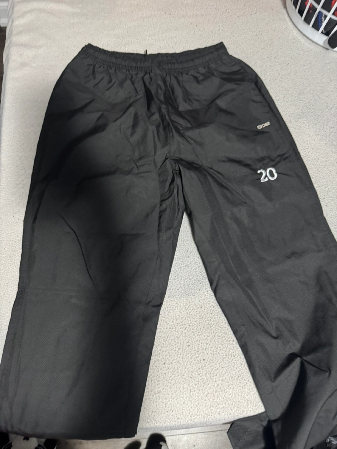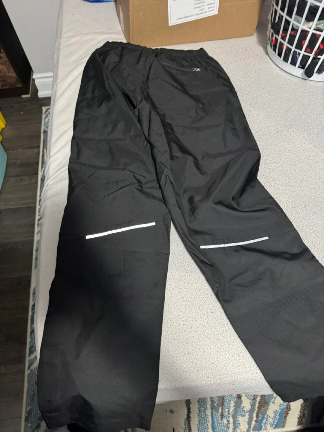 79Black running pants with reflective accents and adjustable ankles. Size medium