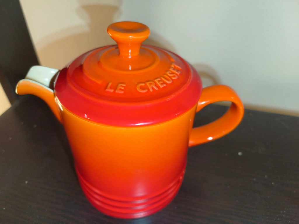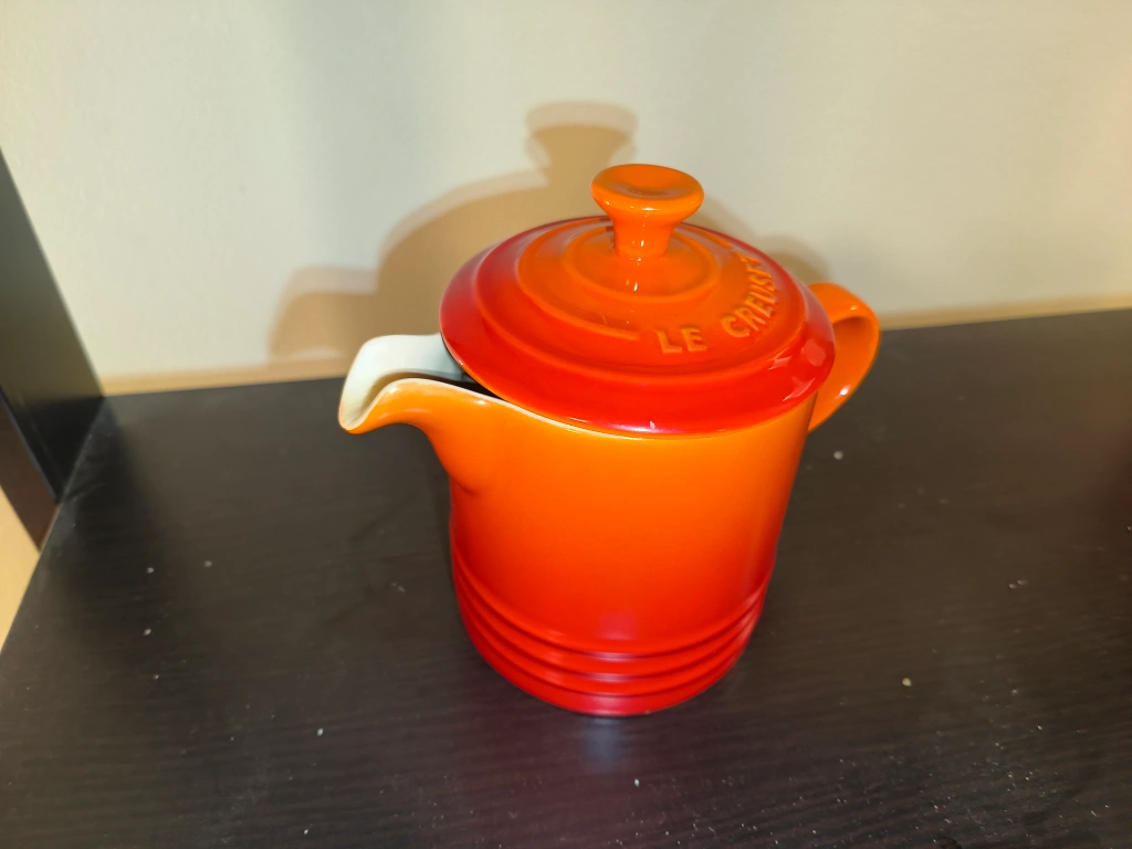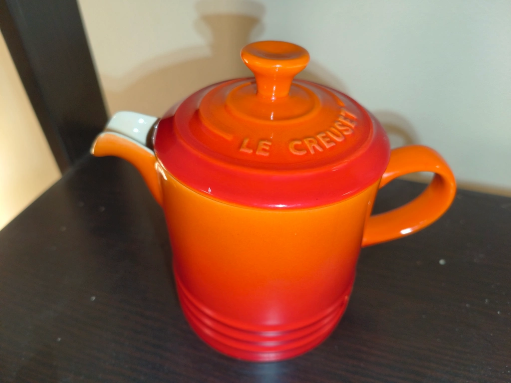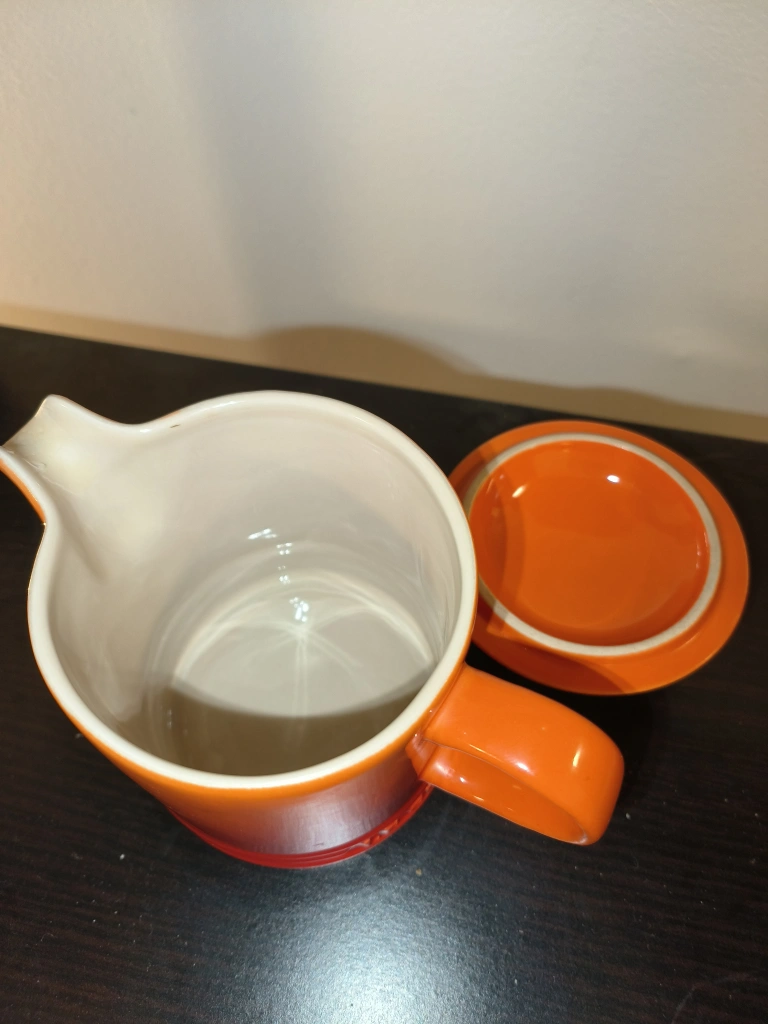Le Creuset. Orange creamer with lid. Great condition. Beautiful piece to serve sauces or creamer with.
