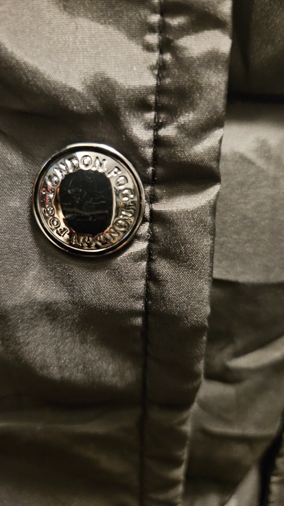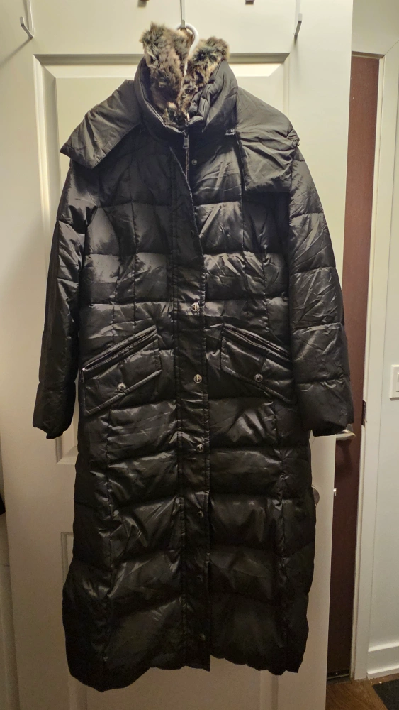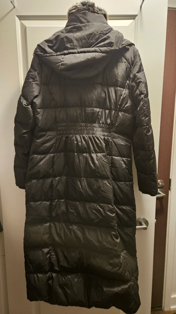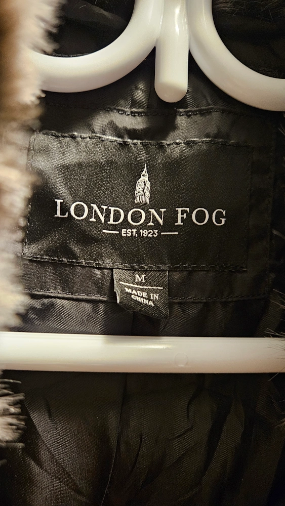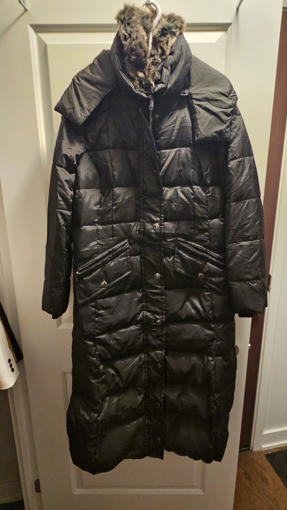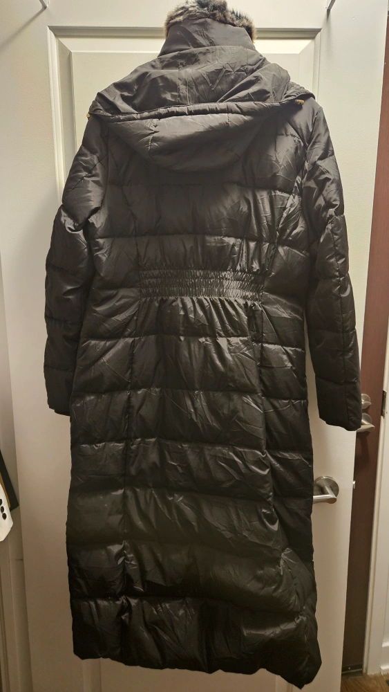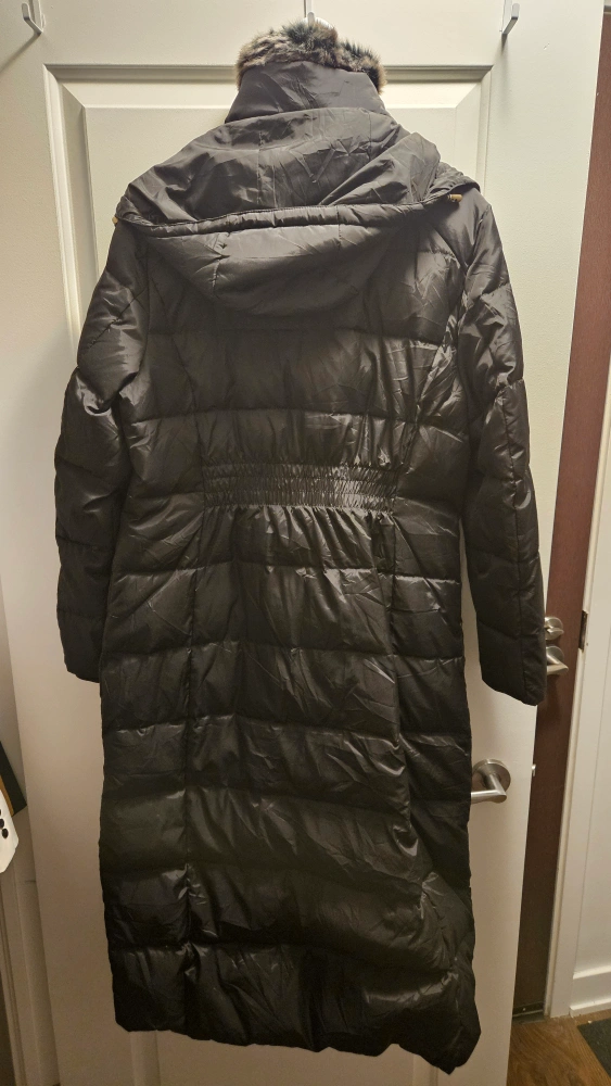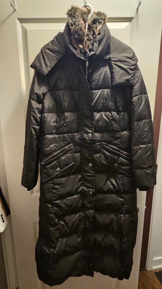Brand new, London Fog, Long black puffer jacket with faux fur hood. Features a zipper and button closure, two front pockets, and a cinched waist.