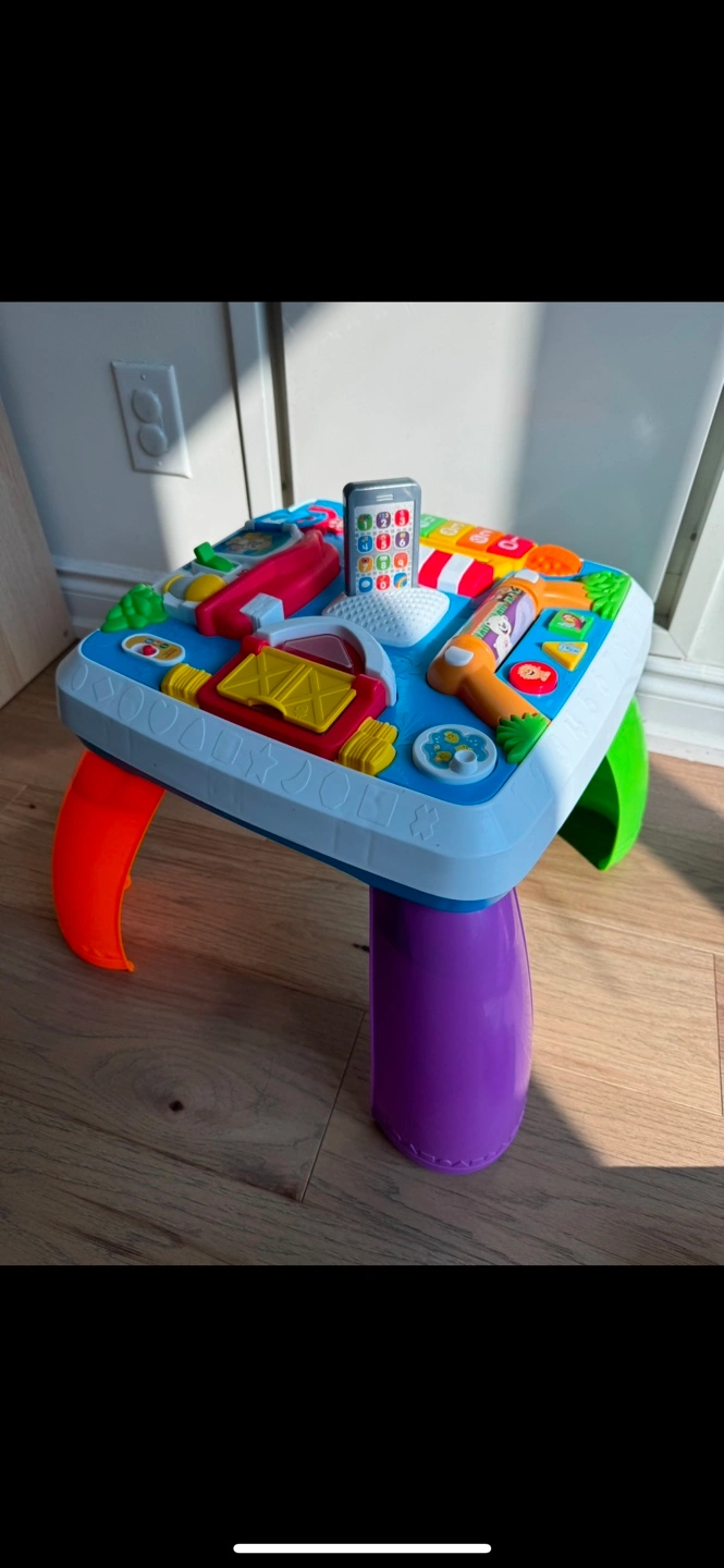 Bundle of various baby toys. Includes an a play table(English/Spanish), a drum, and a bath tub.