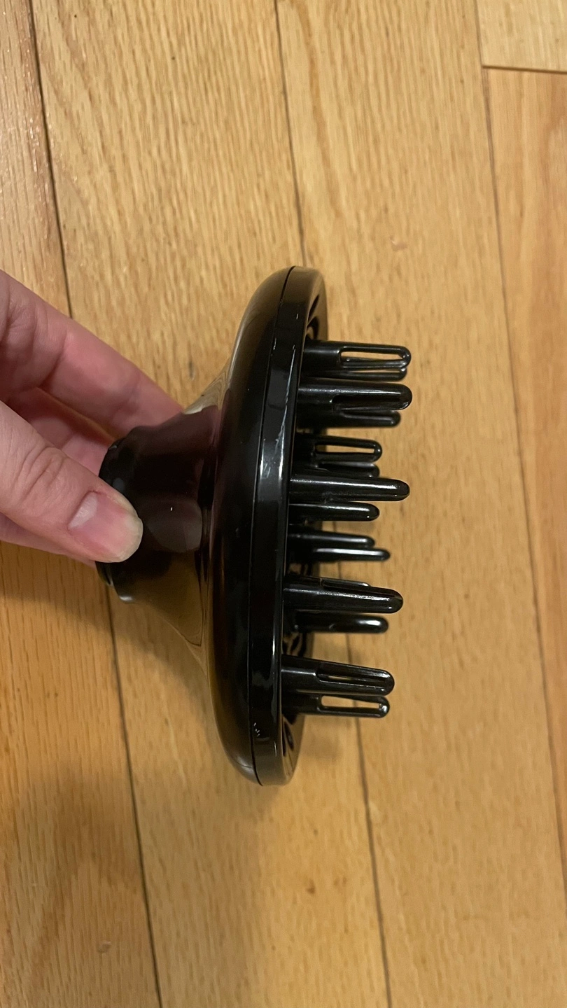 Gold hair dryer with two attachments. The dryer has a black cord, a loop to hang the dryer, and a small button on the top. The diffuser attachment has a ring of prongs, and the other is a concentrator nozzle.