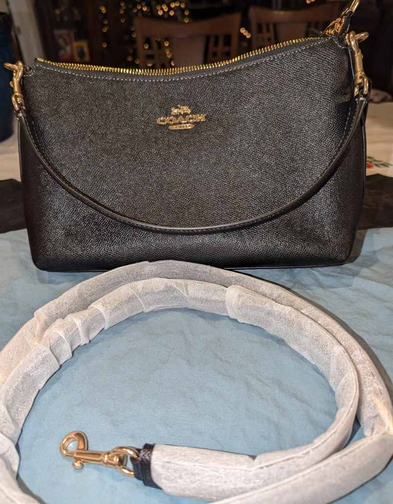 Black leather purse has handles and a brand new detachable strap, only used once or twice. It's in perfect condition.