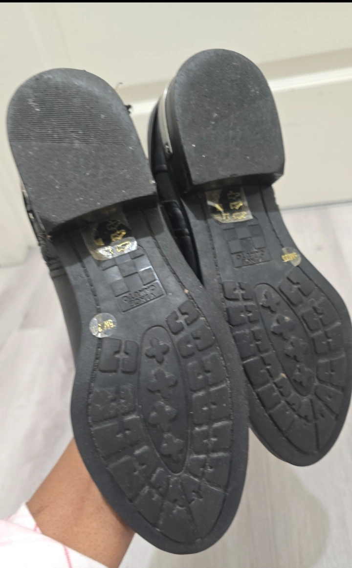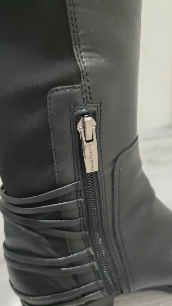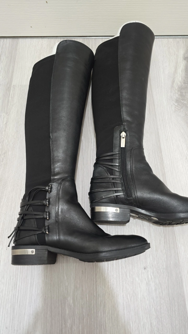 Vince Camuto Payge Over the knee inspired stud and lace details, almond toe, leather upper, neoprene panel with side zip. Stacked 1.25” heel, about 19” shaft, 14.5” leg circumference. 2 of the fringed are loose can be fixed with a little leather glue this does not affect the look of the boot. Size 5M