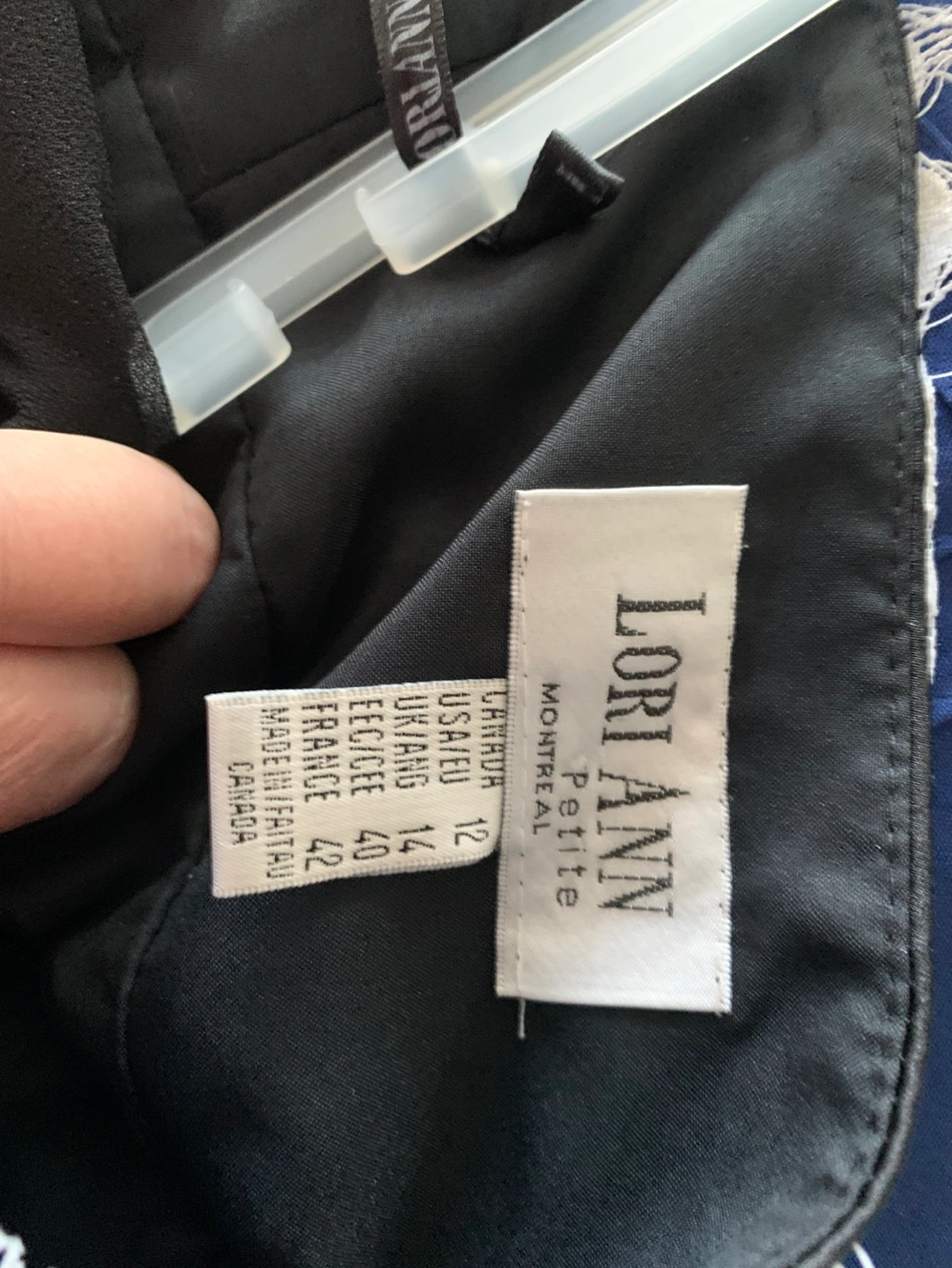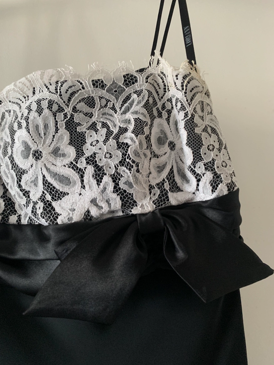 Black dress with white lace bodice and satin bow. Strapless, with thin adjustable straps. A-line silhouette. Hemline is slightly longer in the back.