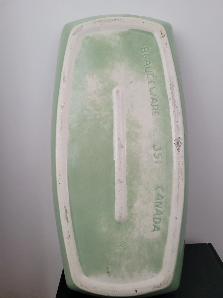 Rectangular serving platter. Green glaze. Made in Quebec, Canada 351 vintage long rectangular serving platter