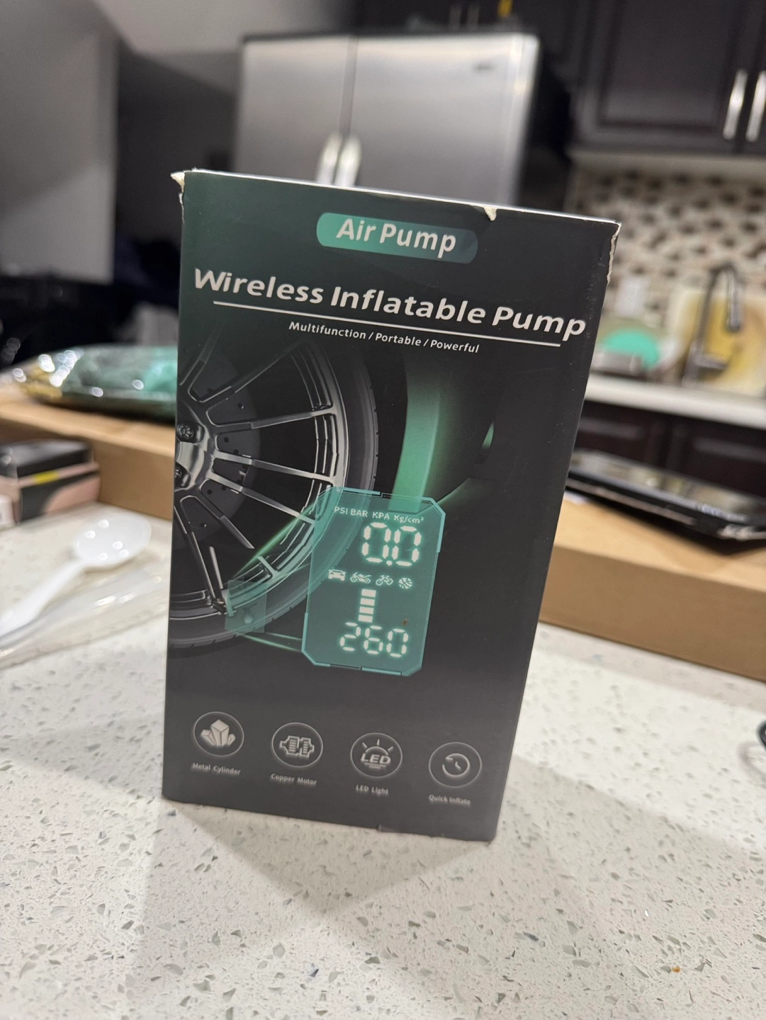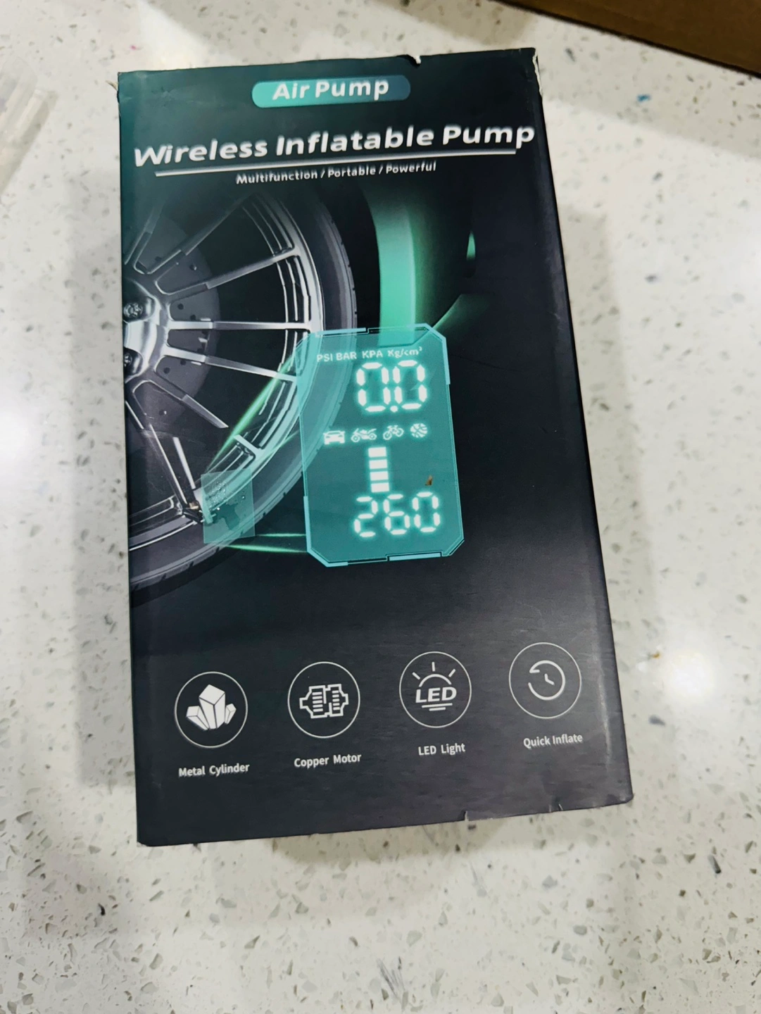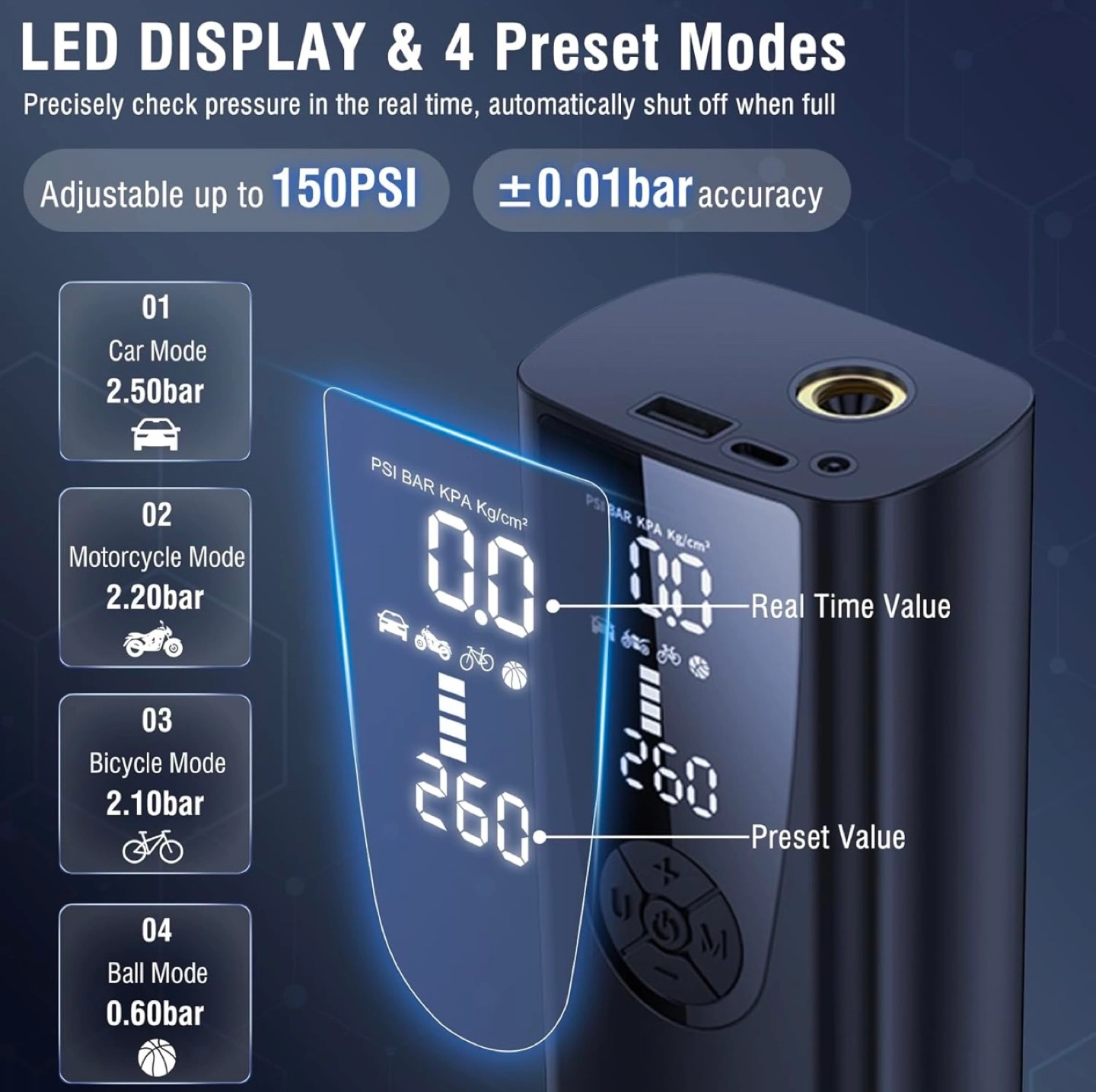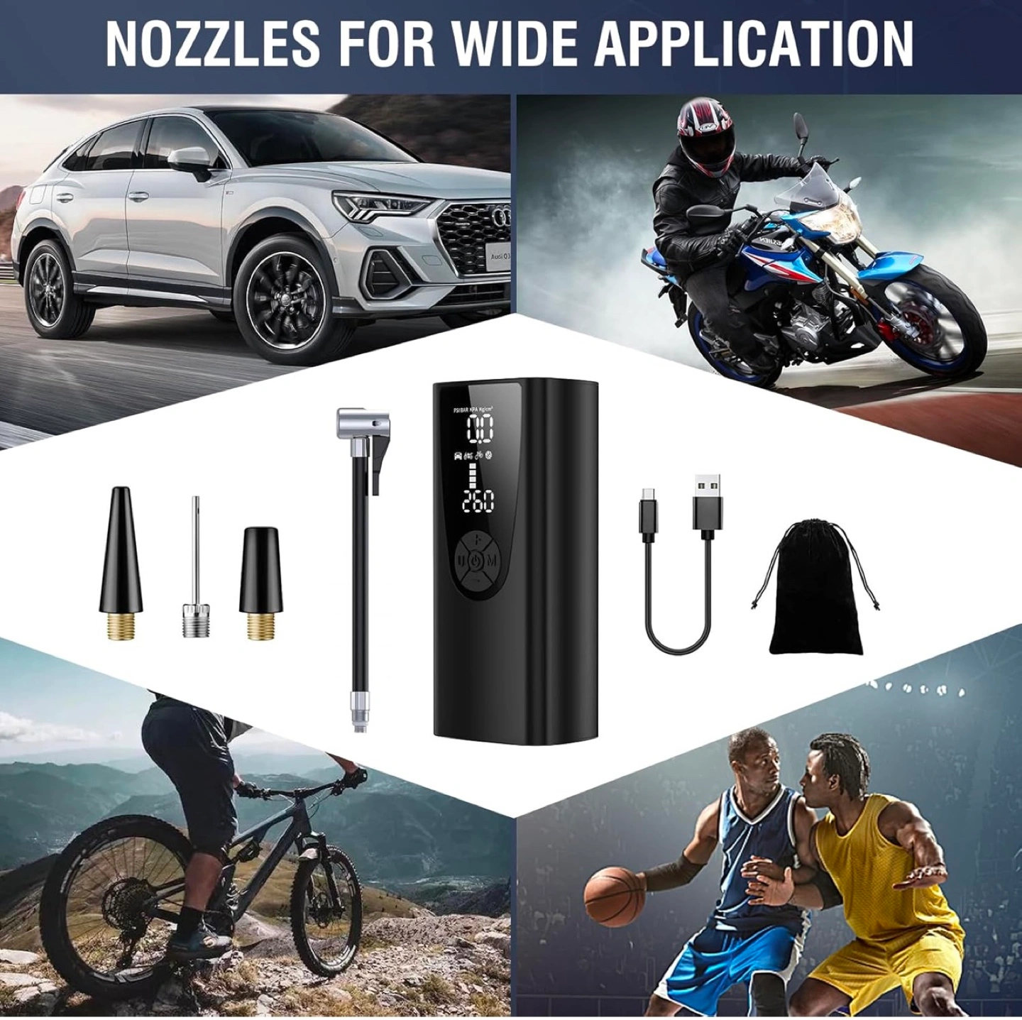Portable wireless inflatable pump with a digital display. Includes different nozzle attachments. Features a flashlight, SOS signal, and a power bank. Adjustable up to 150 PSI.